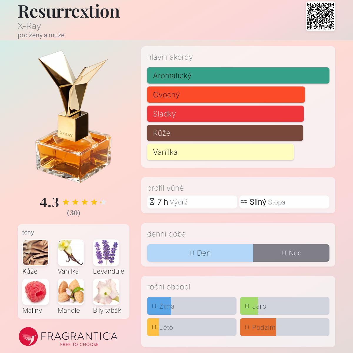 Resurrextion podle X-Ray je Woody Spicy vůně pro ženy a muže. Resurrextion byl/a uveden/a v roce 2012. "Nosem" za touto vůní je Irina Burlakova. Vrchní tóny jsou Levandule, Heřmánek, Petitgrain, Šalvěj muškátová a Hořký pomeranč; střední tóny jsouMaliny, Mandle, Bílý tabák, Kardamom, Pomerančový květ a Koriandr ; základní tóny jsou Kůže, Vanilka, Vetiver, Dubový mech, Tymián a Labdanum.
