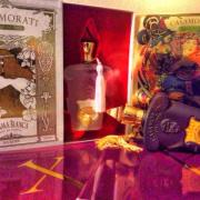Na úhledných kulatých stolech s bílými makramé ubrusy stojí prázdné karafy s třešňovou nálevkou vedle vysokých panákových sklenic na tenkých nožkách. Vedle karaf jsou stříbrné skořápky naplněné bagetami s marmeládou z okvětních lístků růží a Mozartkugely.