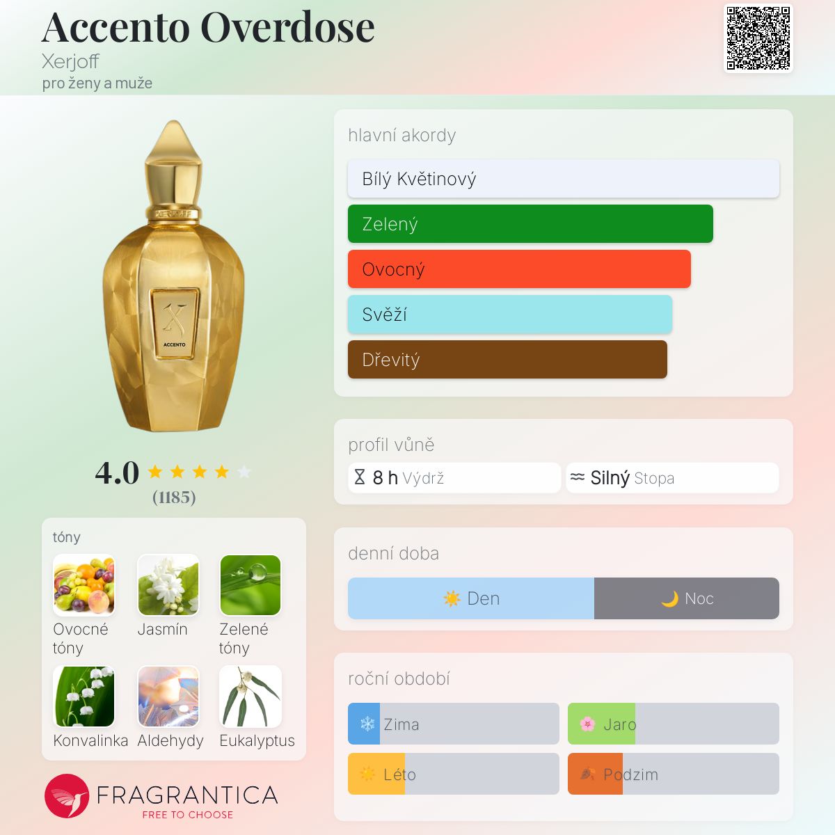 Accento Overdose podle Xerjoff je Floral Aldehyde vůně pro ženy a muže. Accento Overdose byl/a uveden/a v roce 2019. "Nosem" za touto vůní je Christian Carbonnel. Vrchní tóny jsou Ovocné tóny, Zelený tón a Aldehydy; střední tóny jsouEgyptský jasmín, Konvalinka a Bulharská růže ; základní tóny jsou Eukalyptus a Borovice.