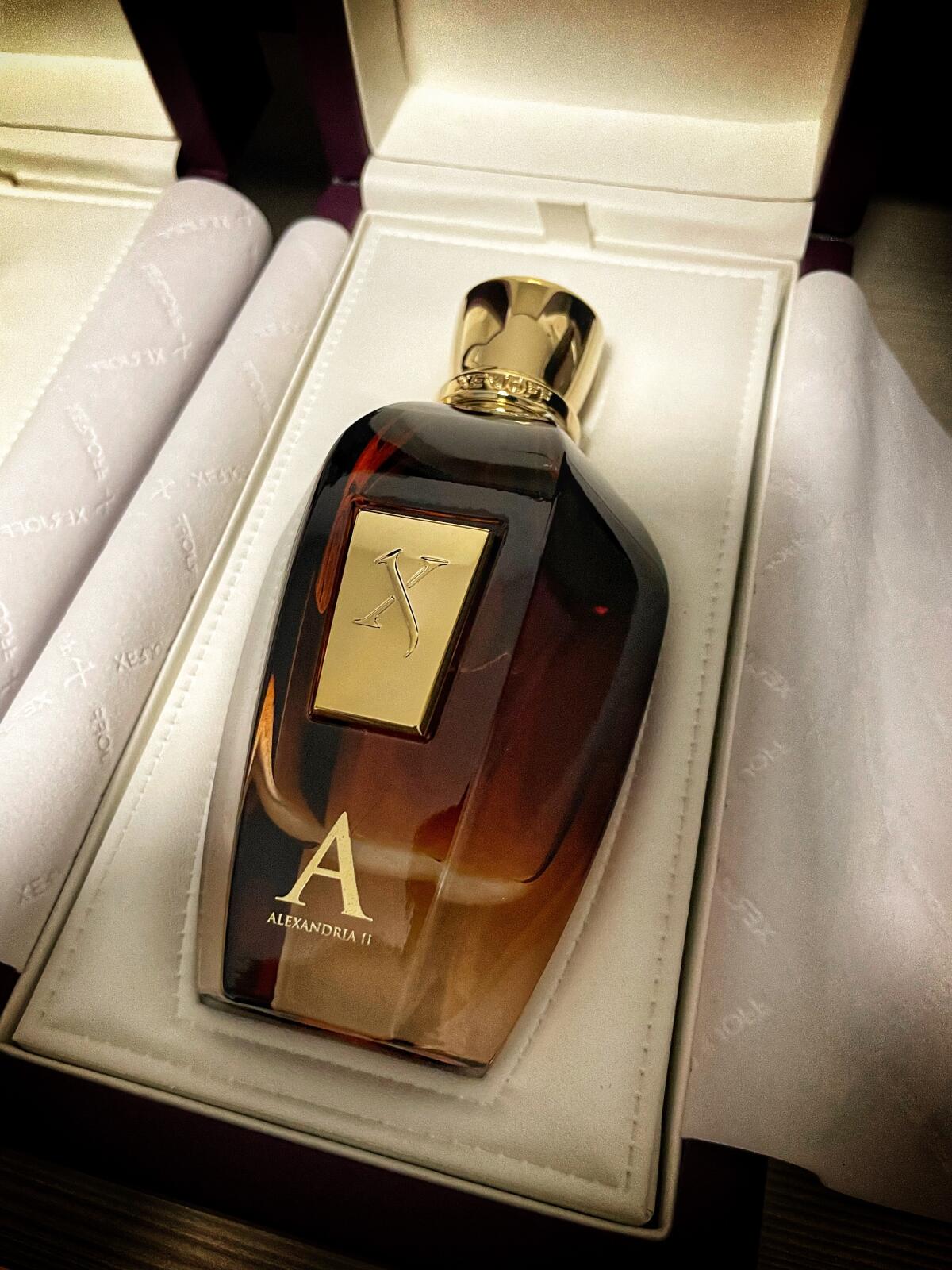Popis tohoto parfému je velmi jednoduchý: představte si, že jste vstoupili do velmi staré knihovny plné historických a významných knih z Alexandrie, po níž je parfém pojmenován, nebo dokonce do starověké hrobky ze starého Egypta. Přesně takový pocit mám já, parfém s velmi příjemnou levandulovou vůní a dřevitým pozadím. Mluvit o jeho kvalitě je poněkud krkolomné, protože Xerjoff je zmíněn již ve vlastním názvu. Před koupí parfému doporučuji zakoupit dekant, protože jeho cena je i na niche parfémy velmi vysoká.