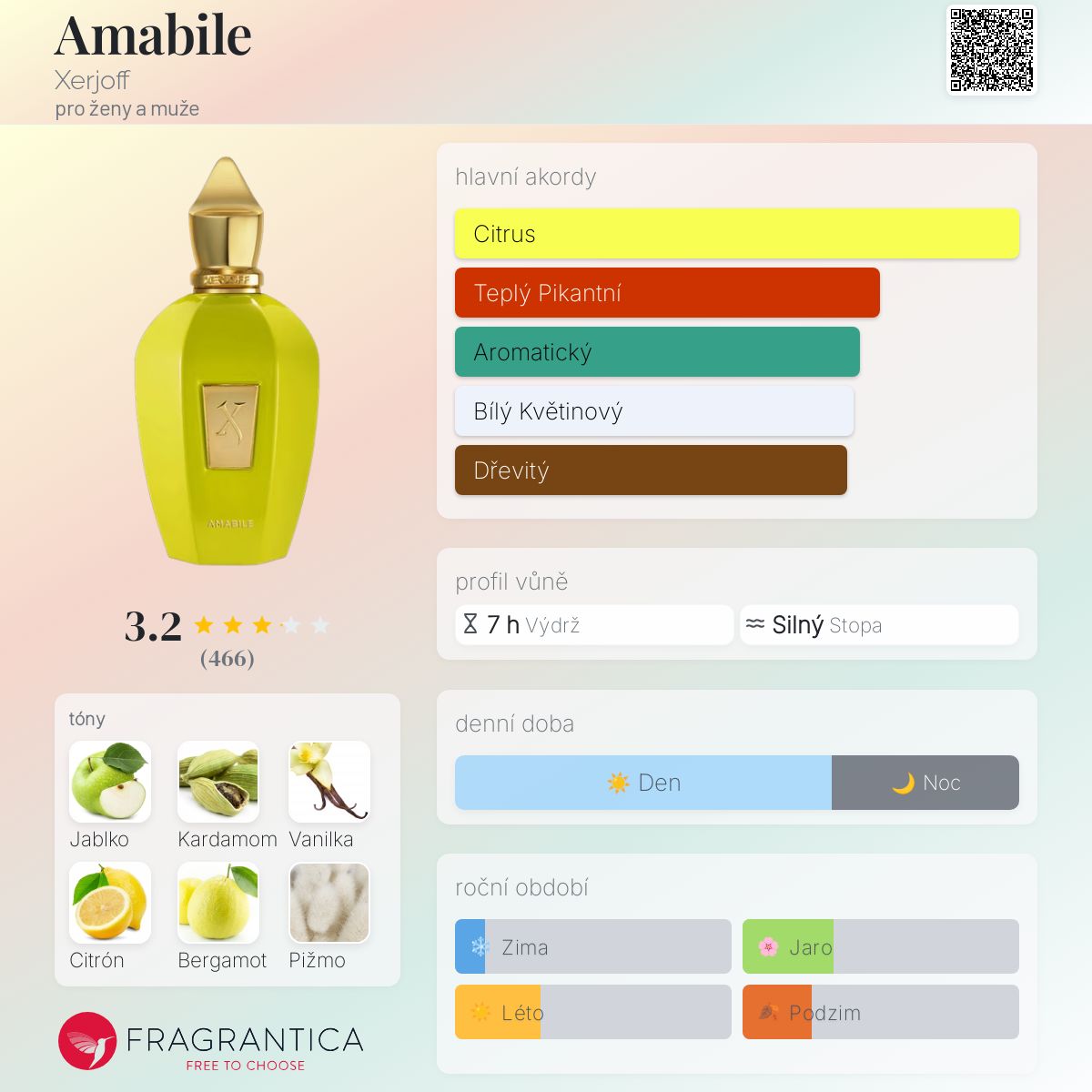 Amabile podle Xerjoff je Woody Aromatic vůně pro ženy a muže. Amabile byl/a uveden/a v roce 2020. "Nosem" za touto vůní je Chris Maurice. Vrchní tóny jsou Zelené jablko, Citron amalfi , Kalábrijský bergamot a Pomerančový květ; střední tóny jsouGuatemalský kardamom, Růžový pepř a Jasmín ; základní tóny jsou Mexická vanilka, Bílé pižmo, Atlasový cedr a Pačuli.