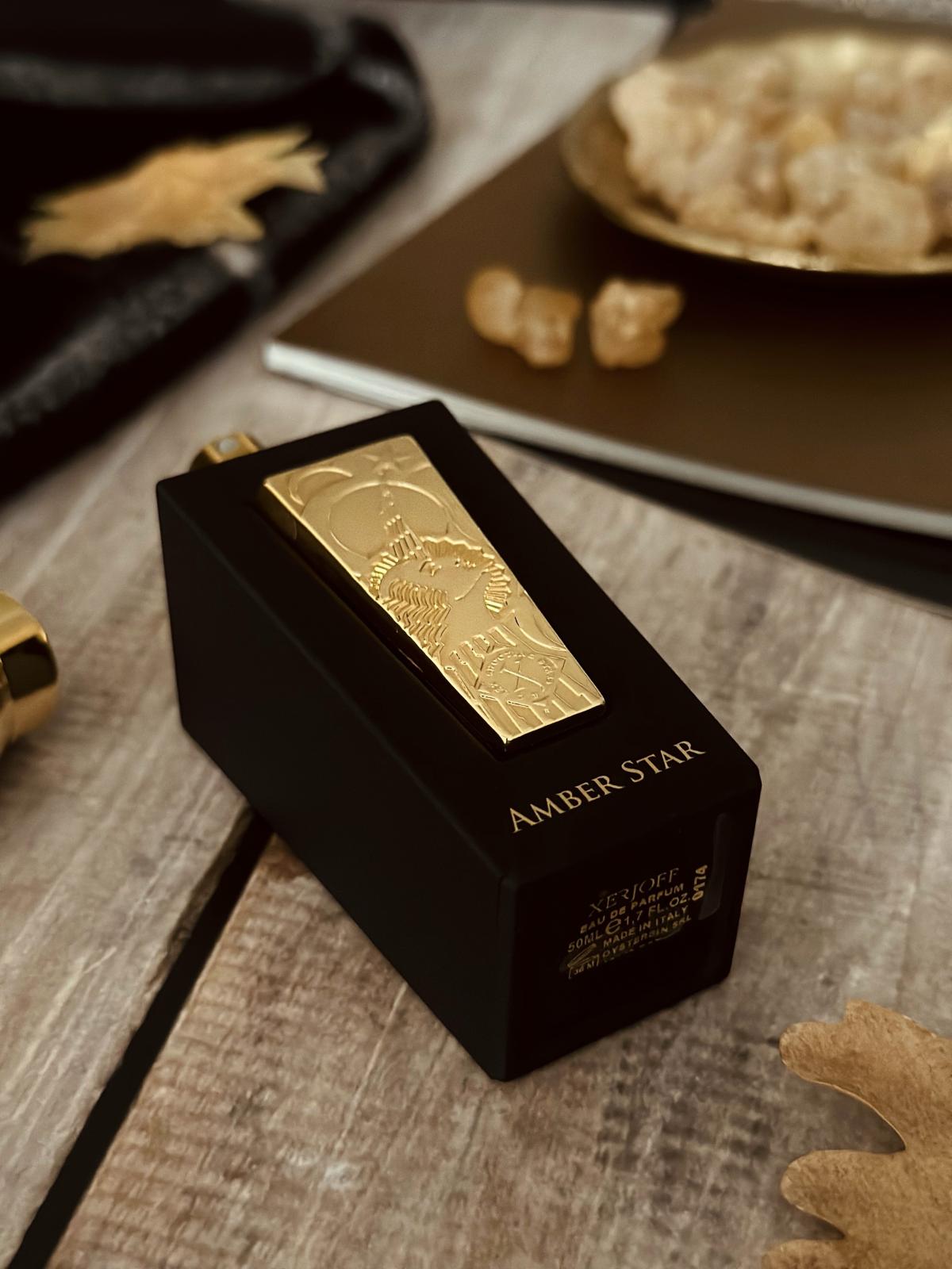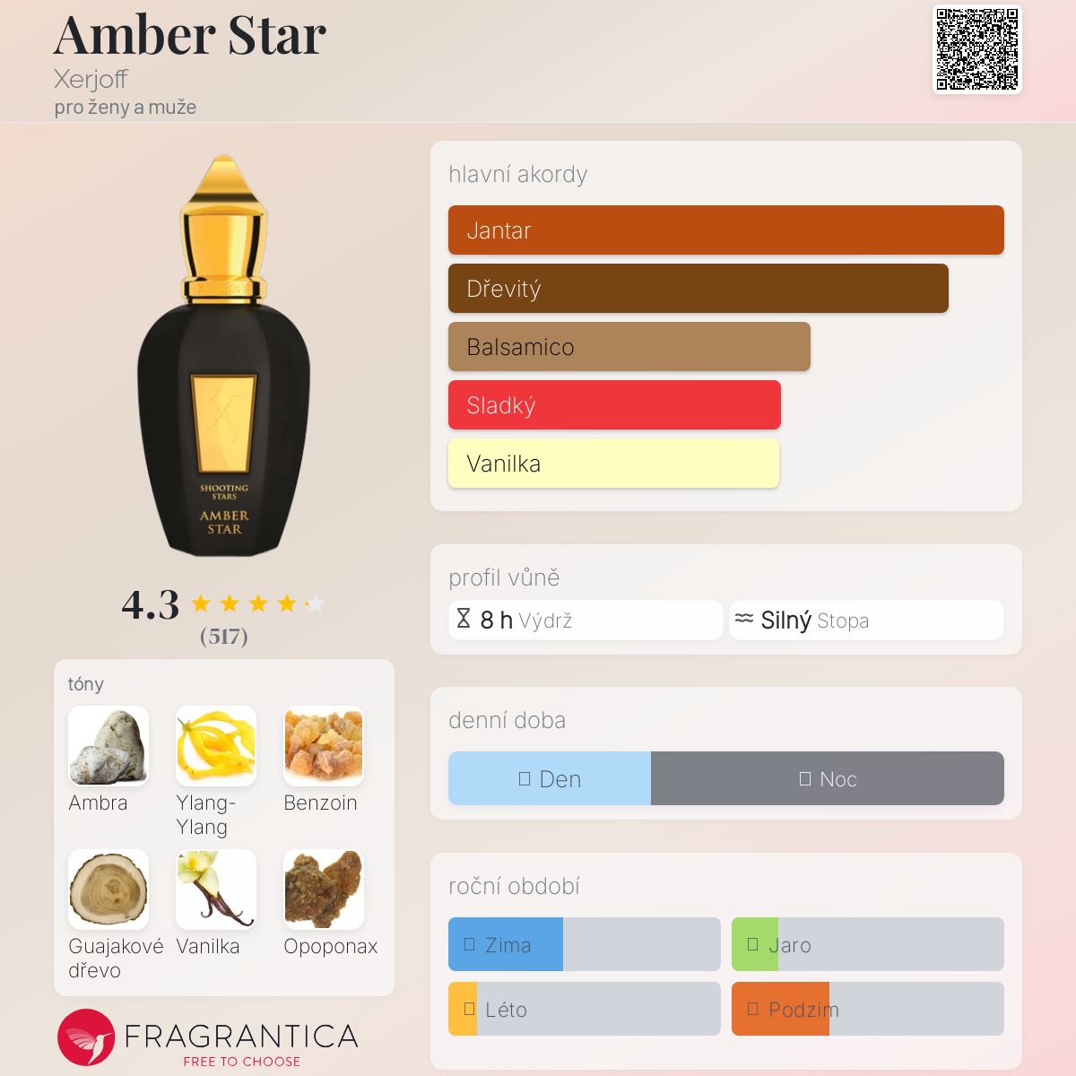 Amber Star podle Xerjoff je Orientální Woody vůně pro ženy a muže. Amber Star byl/a uveden/a v roce 2013. "Nosem" za touto vůní je Chris Maurice. Vrchní tóny jsou Ambra, Ylang-Ylang a Cedr; střední tóny jsouGuajakové dřevo, Myrha a Gurjanský balzám ; základní tóny jsou Benzoin, Vanilka, Opoponax a Santalové dřevo.