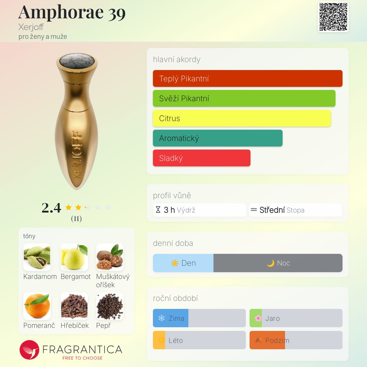 Amphorae 39 podle Xerjoff je vůně pro ženy a muže. Amphorae 39 byl/a uveden/a v roce 2022. Vrchní tóny jsou Kardamom, Kalábrijský bergamot, Brazilský pomeranč, Hřebíček, Černý pepř a Římský kmín; střední tóny jsouMuškátový oříšek a Ylang-Ylang ; základní tóny jsou Pižmo a Madagaskarská vanilka.