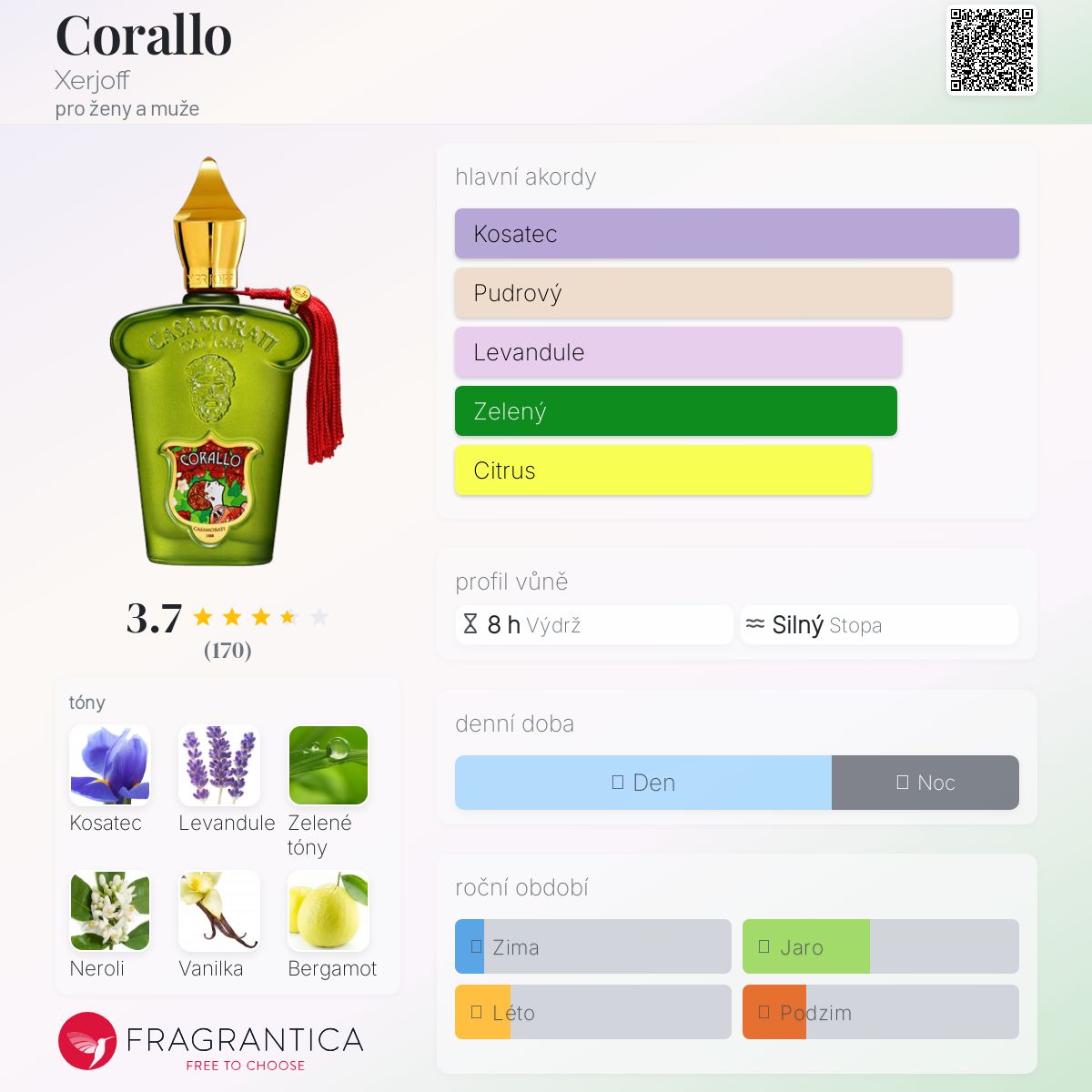 Corallo podle Xerjoff je Floral Green vůně pro ženy a muže. Corallo byl/a uveden/a v roce 2018. Vrchní tóny jsou Levandule, Zelené tóny a Kalábrijský bergamot; střední tóny jsouToskánský kosatec, Neroli a Egyptský jasmín ; základní tóny jsou Vanilka, Jantar (ambra) a Dřevité tóny.