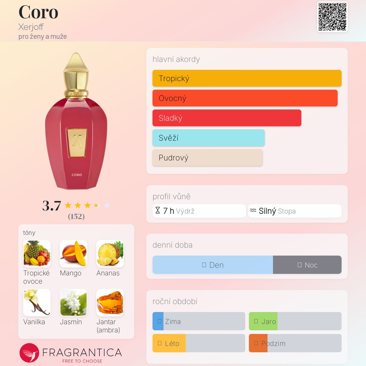 Coro podle Xerjoff je Floral Fruity vůně pro ženy a muže. Toto je nová vůně. Coro byl/a uveden/a v roce 2025. Vrchní tón je Tropické ovoce ; střední tóny jsouMango, Ananas a Jasmín ; základní tóny jsou Vanilka, Jantar (ambra), Pižmo a Santalové dřevo.