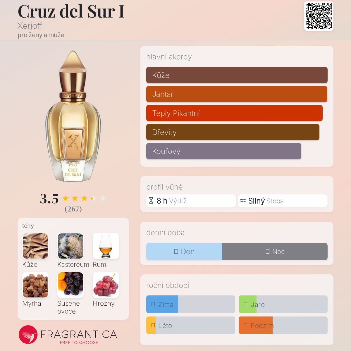 Cruz del Sur I podle Xerjoff je Orientální Spicy vůně pro ženy a muže. Cruz del Sur I byl/a uveden/a v roce 2017. "Nosem" za touto vůní je Miroslav Petkov. Vrchní tóny jsou Rum, Hrozny a Bergamot; střední tóny jsouSušené ovoce, Hřebíček, Kmín, Cedr a Skořice ; základní tóny jsou Kůže, Kastoreum, Myrha, Kadidlo, Labdanum, Jantar (ambra) a Santalové dřevo.