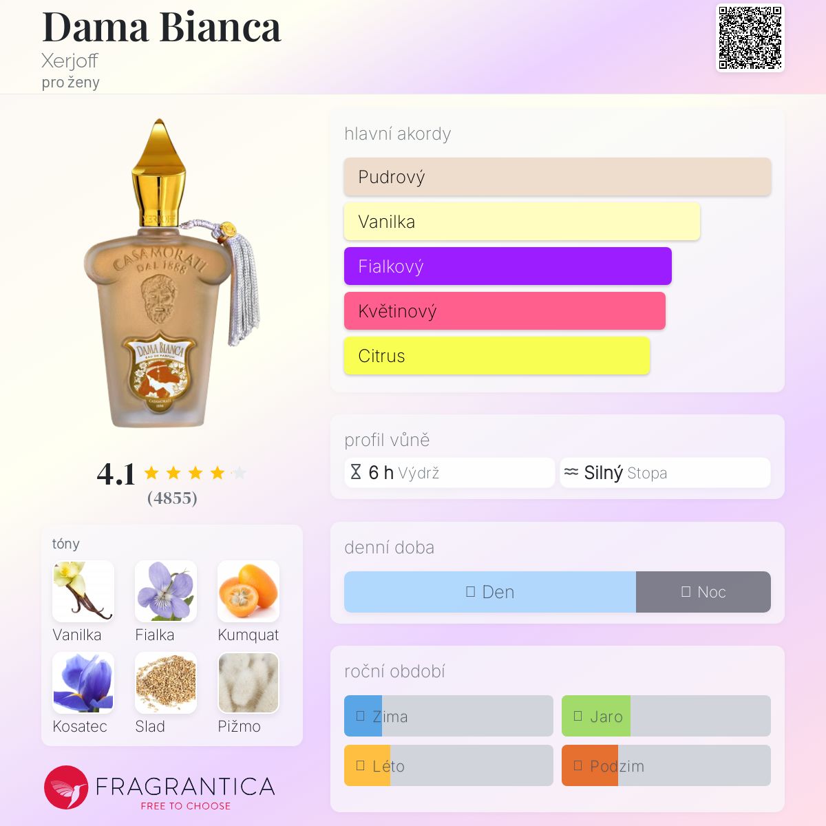 Dama Bianca podle Xerjoff je Floral Woody Musk vůně pro ženy. Dama Bianca byl/a uveden/a v roce 2012. Vrchní tóny jsou Kumquat a Limetka; střední tóny jsouFialka, Italský kosatec, Šeřík, Egyptský jasmín a Konvalinka ; základní tóny jsou Vanilka, Slad, Bílé pižmo, Ambrette (přírodní pižmo), Santalové dřevo a Cedr.