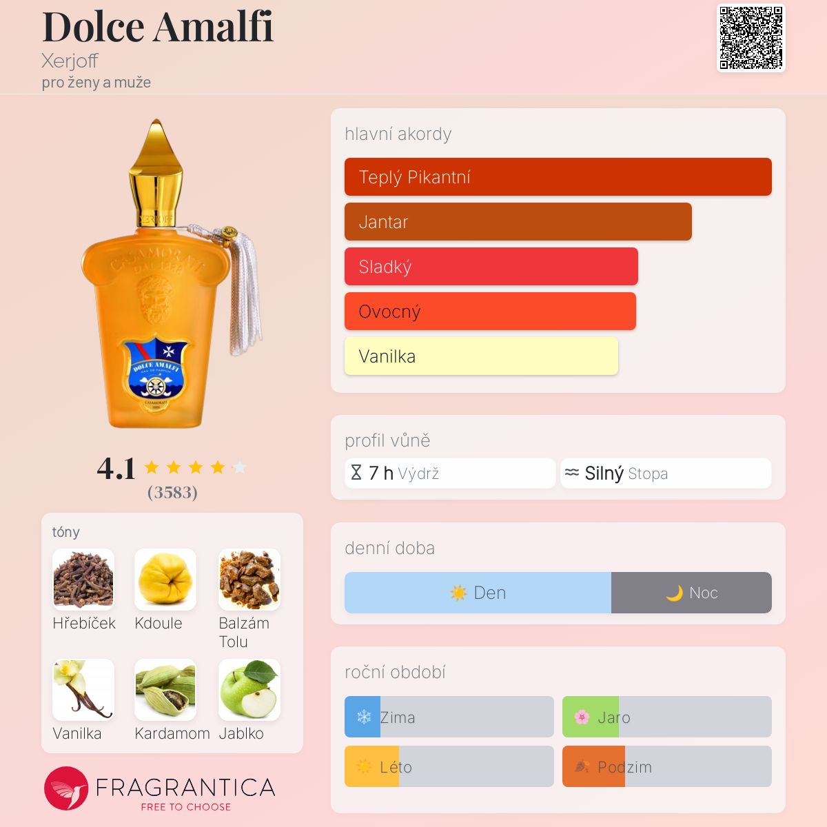 Dolce Amalfi podle Xerjoff je Orientální vůně pro ženy a muže. Dolce Amalfi byl/a uveden/a v roce 2017. "Nosem" za touto vůní je Miroslav Petkov. Vrchní tóny jsou Kdoule, Kardamom, Jablko a Šafrán; střední tóny jsouHřebíček, Balzám Tolu a Kadidlo ; základní tóny jsou Vanilka, Fazole tonka, Jantar (ambra), Cedr a Pižmo.