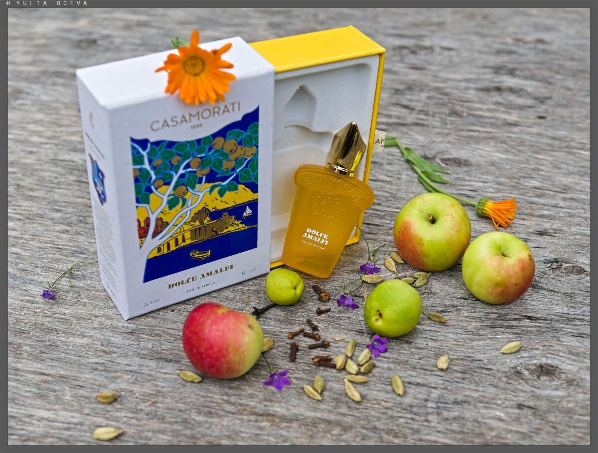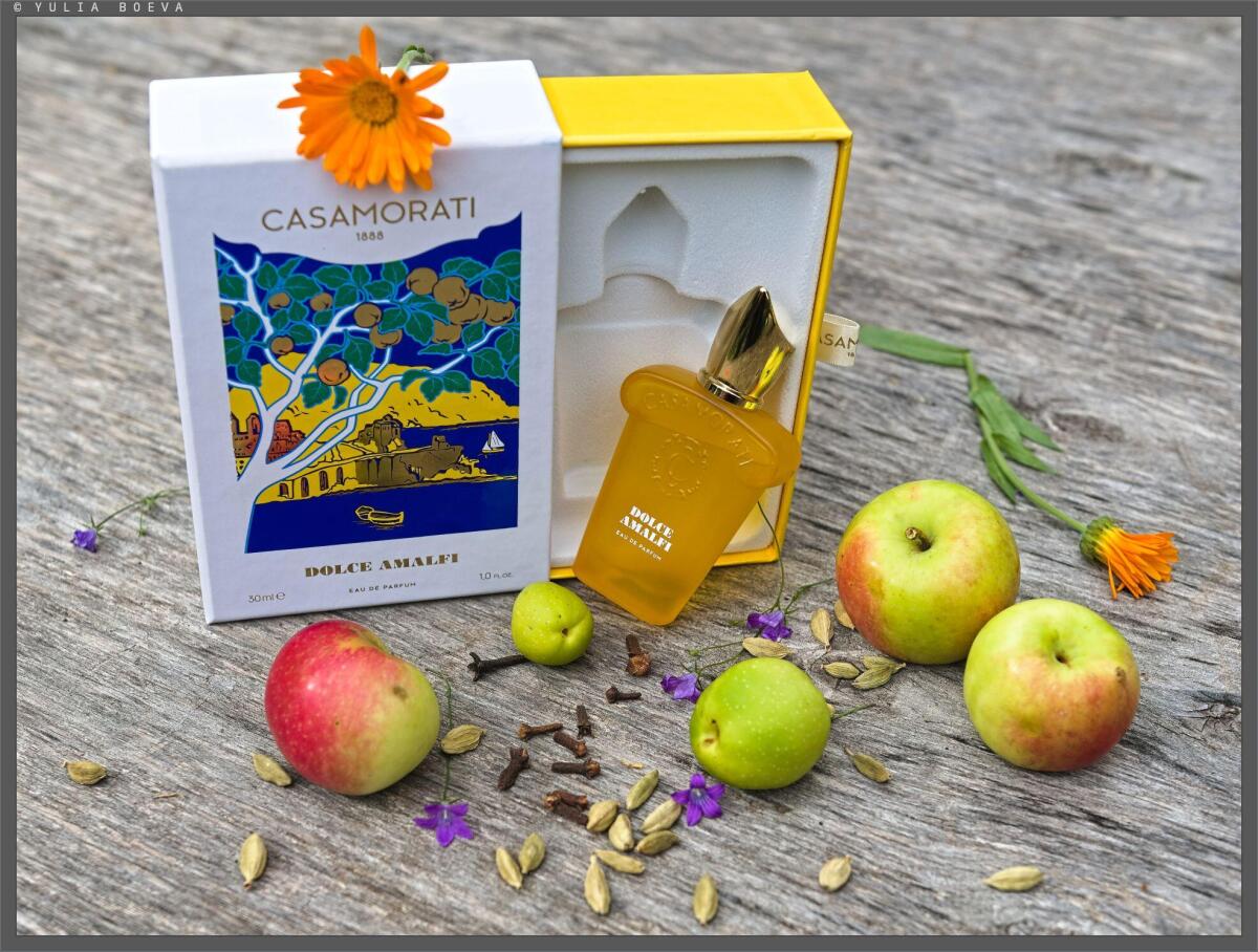 Spolu s nákupem Casamorati's Lira z oficiálních webových stránek jsem měla možnost nechat si zdarma zaslat sadu vzorků s jejich vůněmi: Dolce Amalfi jsem si nevybrala, protože čichová pyramida 🍎🍏 mě vůbec neoslovila. Přišlo mi, že je to kopie La Danza delle Libellule od Nobile 1942, která mi přišla odporná. Po několika týdnech jsem šla kolem obchodu s nikovými vůněmi, protože jsem měla náladu na kořeněný parfém, a prodavačka mi ho navrhla. Jaké překvapení! Velmi mě zaujala... kořeněná, svěží, šťavnatá... V úvodu převezme hlavní roli kdoule... ne kyselé jablko, ale velmi sladké, jemné... Hned poté se objeví hřebíček, který vůni osvěží a zabrání tomu, aby se stala fádní... Nakonec se objeví vynikající dřeva, která vůni provázejí po zbytek jejího trvání.
