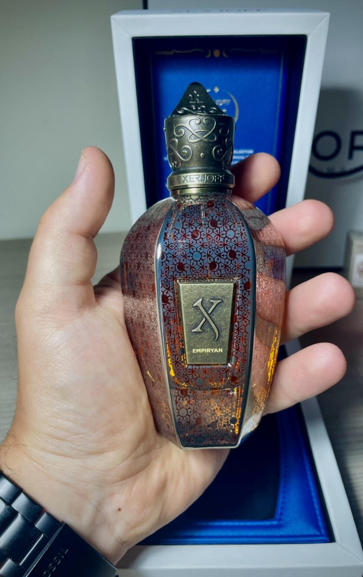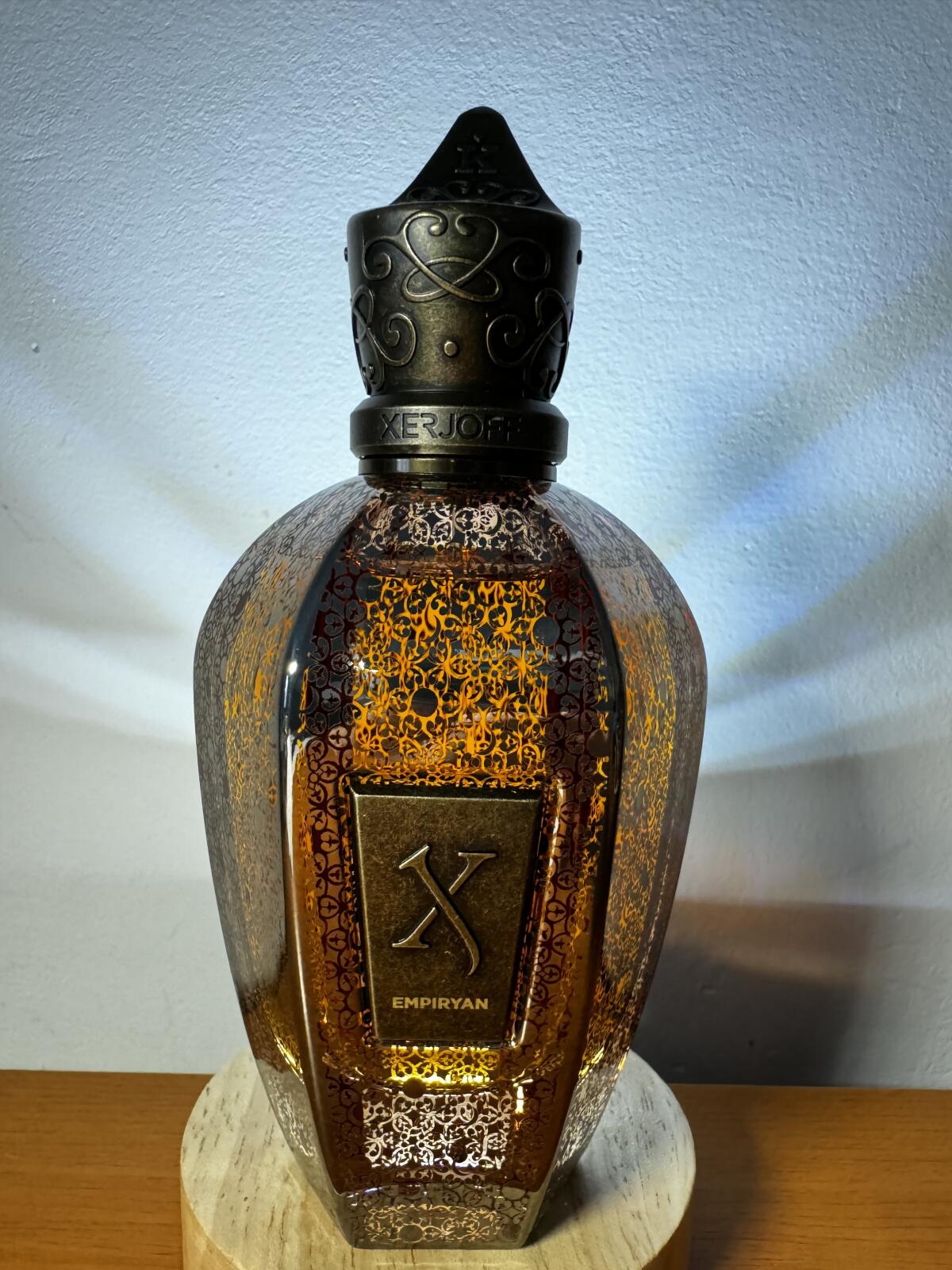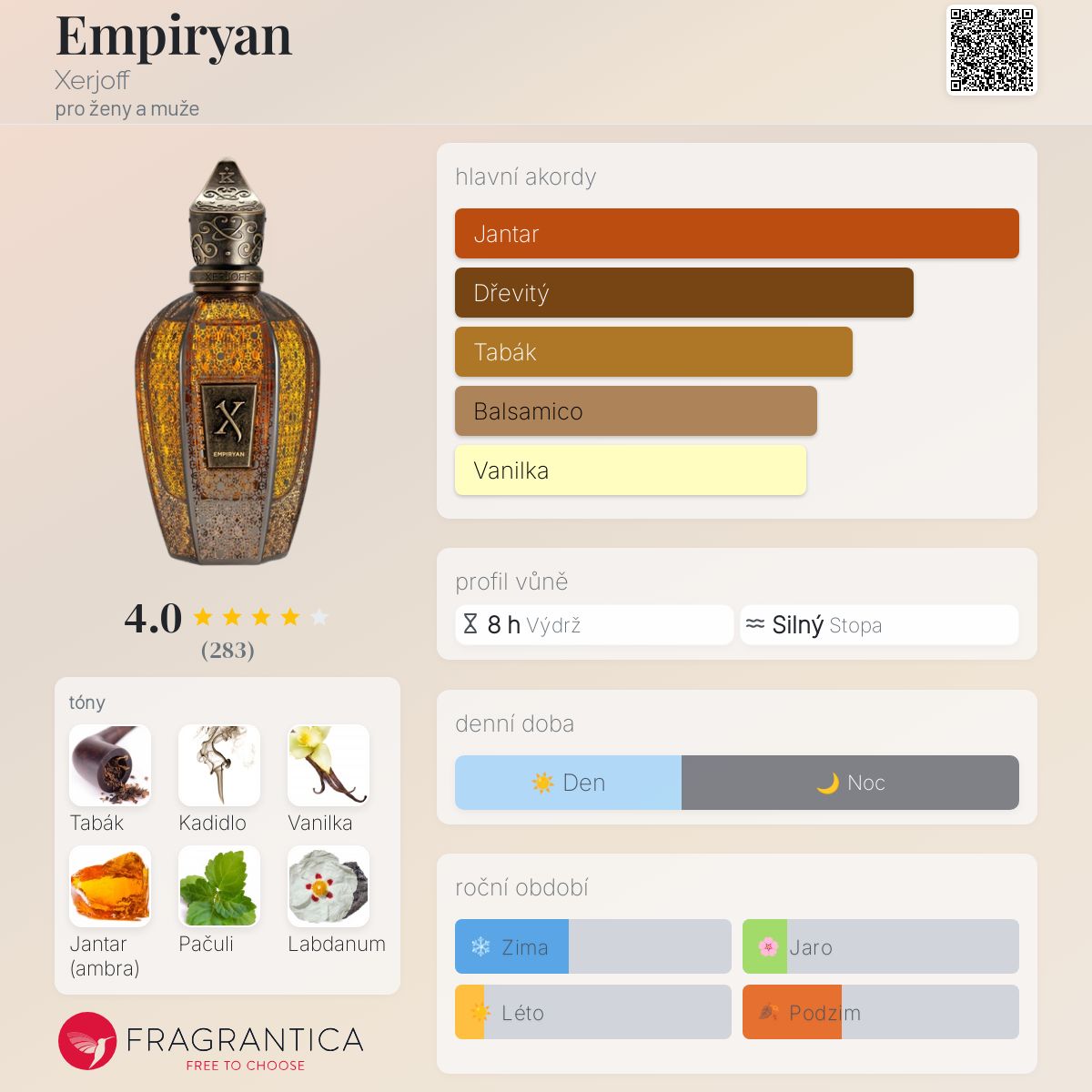 Empiryan podle Xerjoff je vůně pro ženy a muže. Empiryan byl/a uveden/a v roce 2023. Vrchní tóny jsou Tabákový list a Cypriolový olej; střední tóny jsouKadidlo, Singapurské pačuli a Atlasový cedr ; základní tóny jsou Madagaskarská vanilka, Jantar (ambra) a Labdanum.