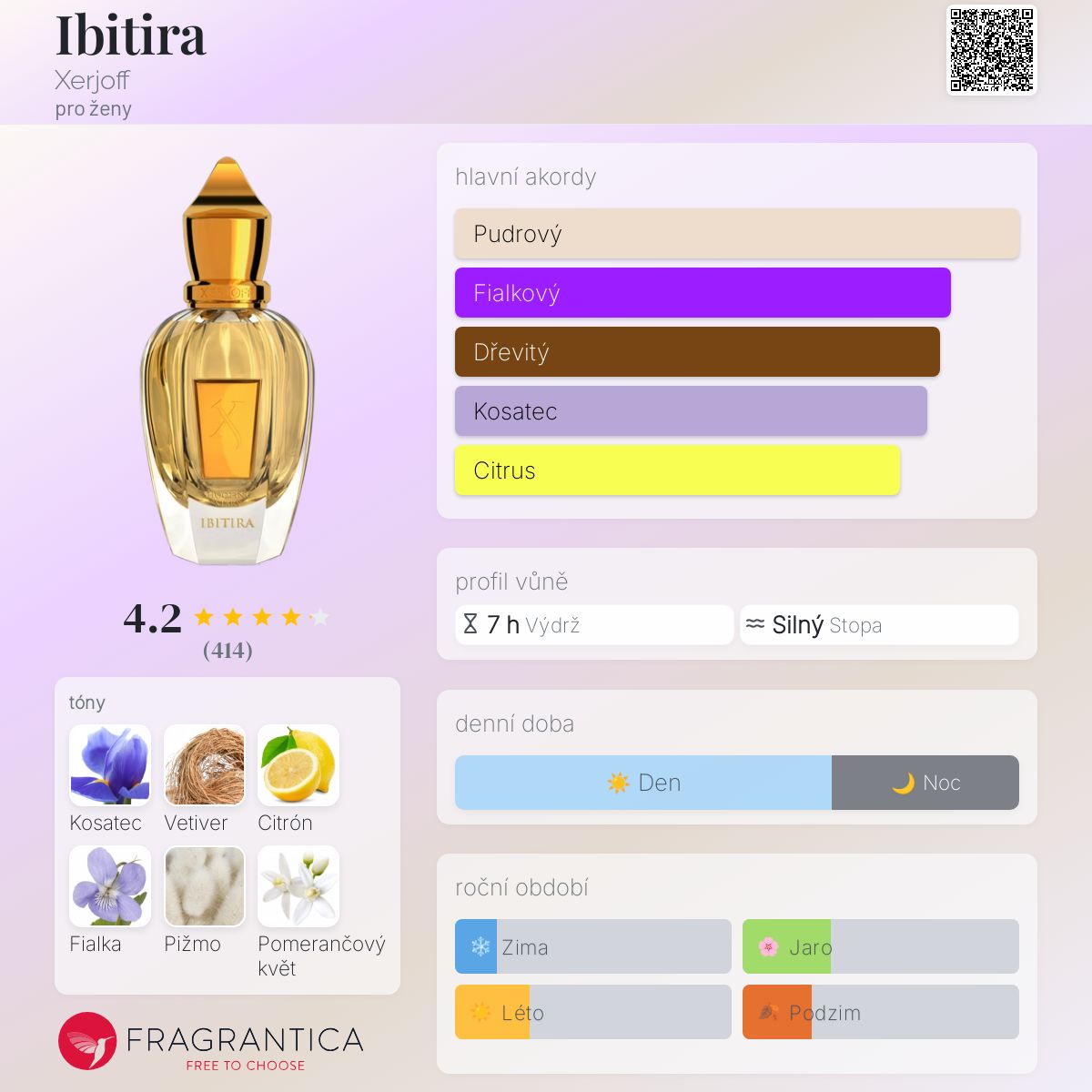Ibitira podle Xerjoff je Floral vůně pro ženy. Ibitira byl/a uveden/a v roce 2009. Vrchní tóny jsou Citrón, Fialka a Pomerančový květ; střední tóny jsouKosatec, Bílé květy, Neroli a Damašská růže ; základní tóny jsou Vetiver, Pižmo, Cedr a Vanilka.