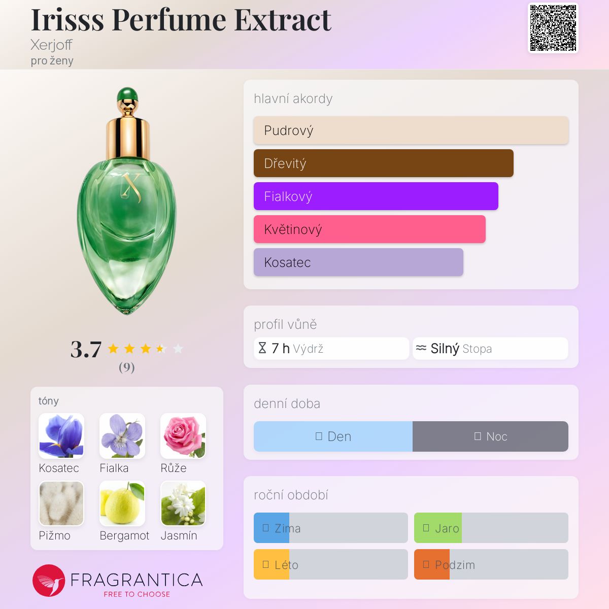 Irisss Perfume Extract podle Xerjoff je Floral vůně pro ženy. "Nosem" za touto vůní je Chris Maurice. Vrchní tóny jsou Bergamot, Semena mrkve a Karafiát; střední tóny jsouKosatec, Fialka, Růže, Jasmín a Ylang-Ylang ; základní tóny jsou Pižmo, Cedr, Vetiver, Benzoin a Kadidlo.