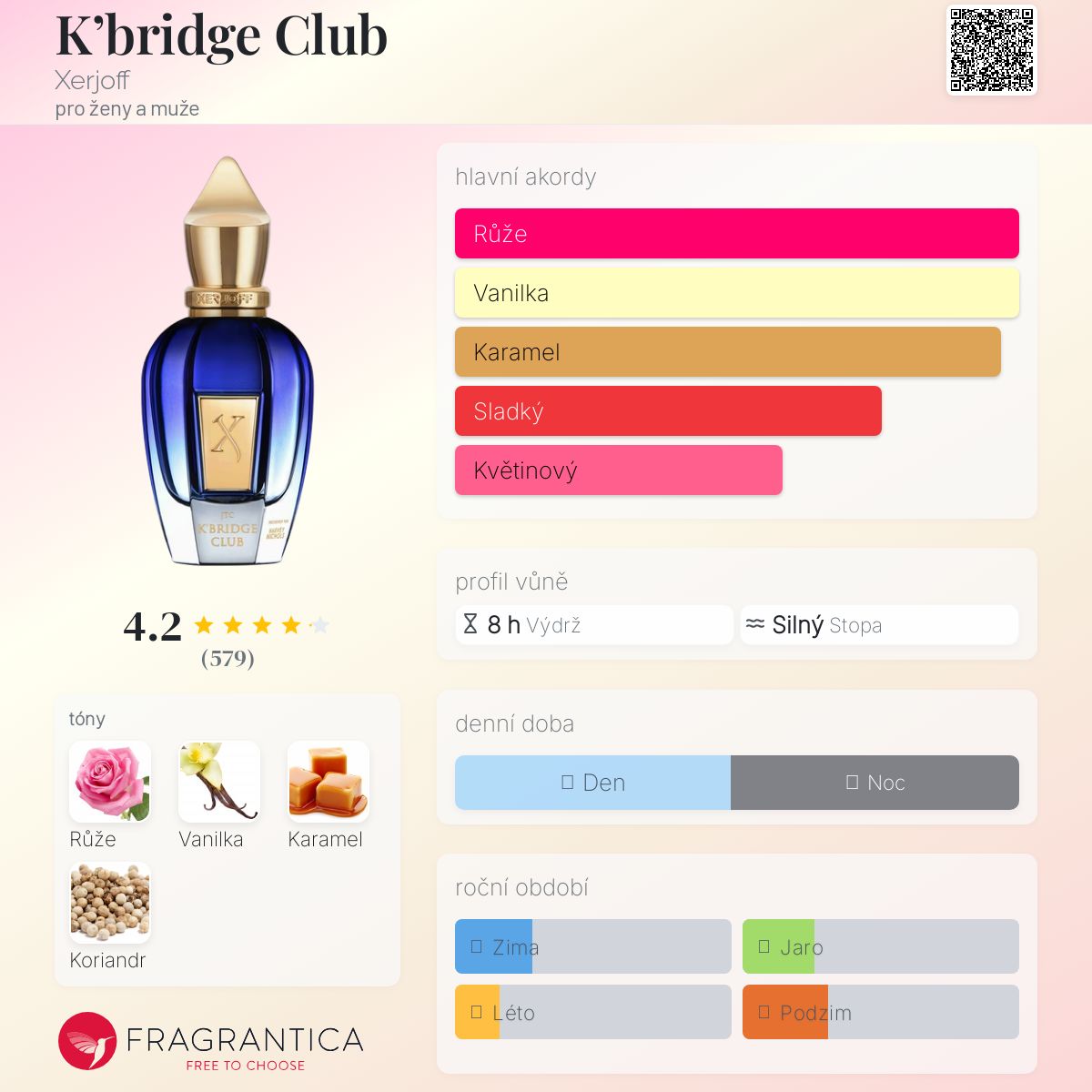 K’bridge Club podle Xerjoff je vůně pro ženy a muže. K’bridge Club byl/a uveden/a v roce 2019. "Nosem" za touto vůní je Chris Maurice. Vrchní tón je Bulharská růže ; střední tóny jsouRůže a Koriandr ; základní tóny jsou Bourbonská vanilka a Karamel.