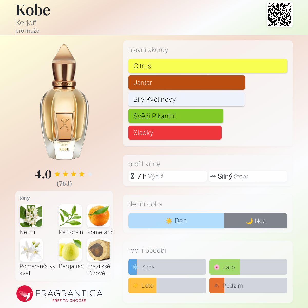 Kobe podle Xerjoff je Citrus Aromatic vůně pro muže. Kobe byl/a uveden/a v roce 2009. Vrchní tóny jsou Pomeranč, Bergamot a Labdanum; střední tóny jsouNeroli, Petitgrain a Pomerančový květ ; základní tóny jsou Brazilské růžové dřevo, Benzoin, Fazole tonka, Ambra, Agarové dřevo (oud), Pižmo a Styrax.