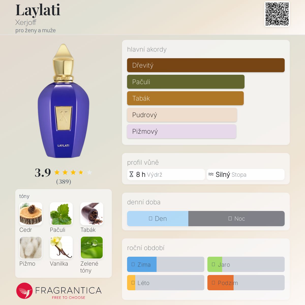 Laylati podle Xerjoff je Orientální Woody vůně pro ženy a muže. Laylati byl/a uveden/a v roce 2019. "Nosem" za touto vůní je Chris Maurice. Vrchní tón je Zelené tóny ; střední tóny jsouCedr a Pačuli ; základní tóny jsou Tabák, Pižmo a Vanilka.