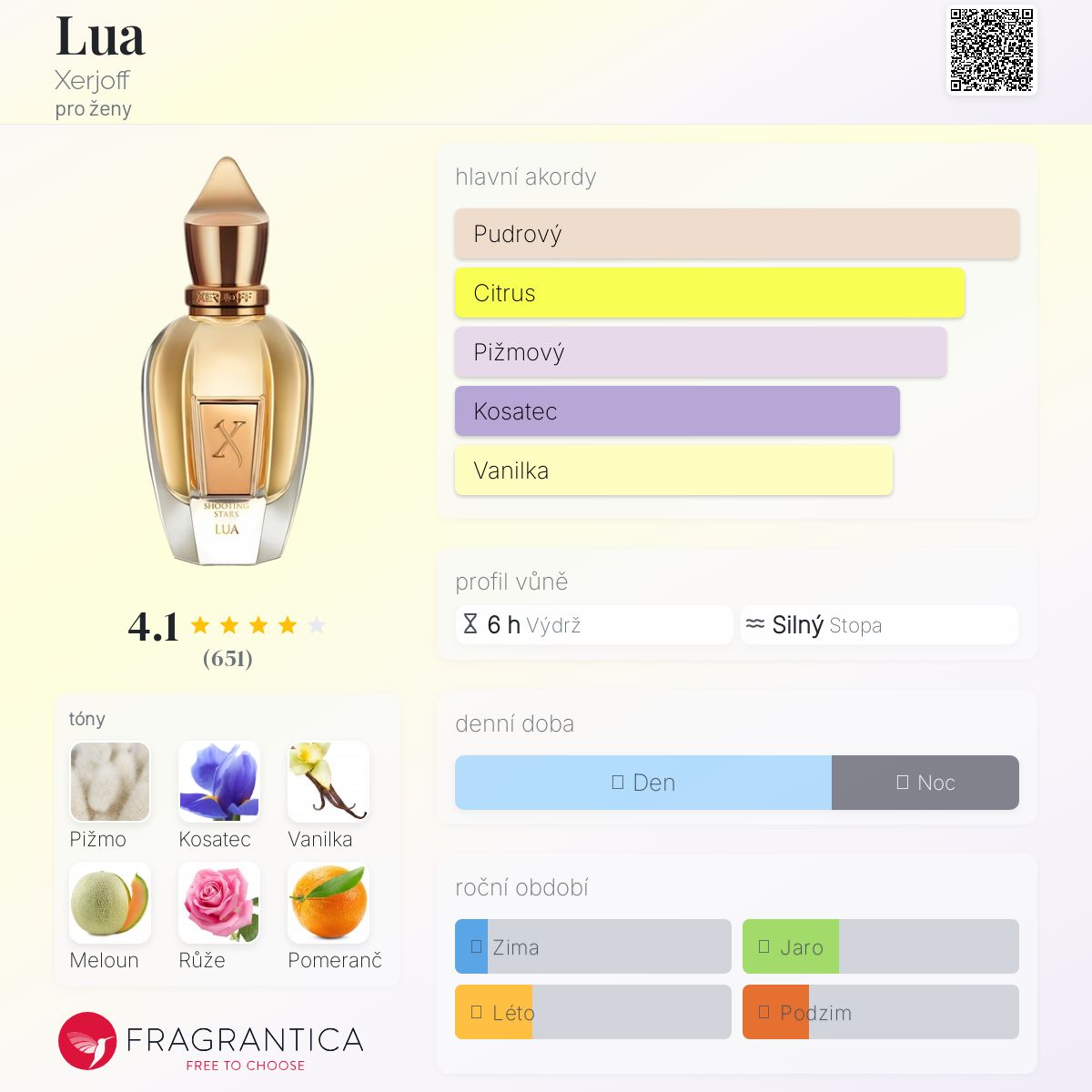 Lua podle Xerjoff je Floral Fruity vůně pro ženy. Lua byl/a uveden/a v roce 2009. Vrchní tóny jsou Meloun, Pomeranč a Bergamot; střední tóny jsouKosatec, Růže, Konvalinka a Růžový pepř ; základní tóny jsou Pižmo, Vanilka, Pačuli a Cedr.