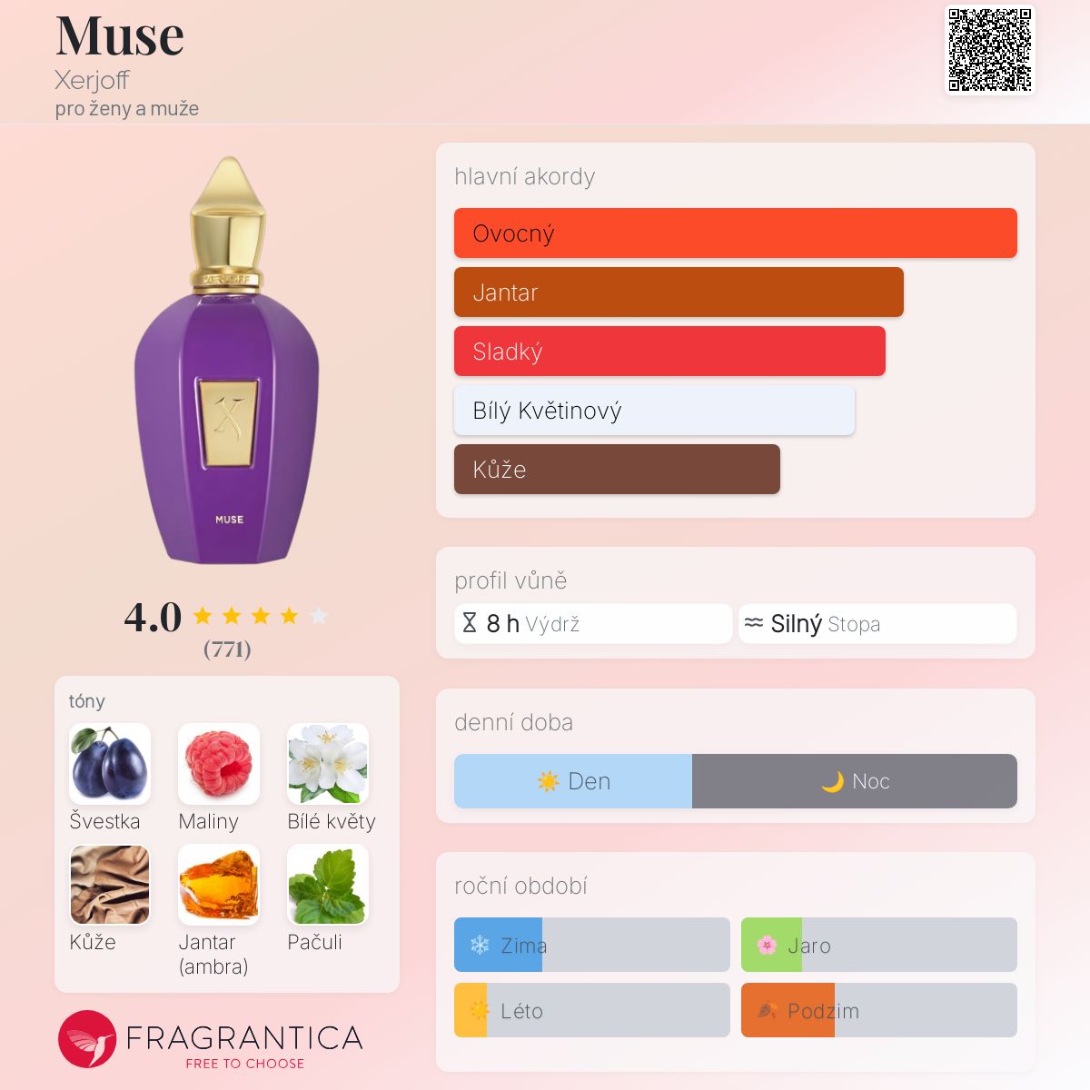 Muse podle Xerjoff je Chypre Fruity vůně pro ženy a muže. Muse byl/a uveden/a v roce 2019. Vrchní tóny jsou Švestka, Bílé květy a Kůže; střední tóny jsouJasmín, Davana a Labdanum ; základní tóny jsou Maliny, Jantar (ambra), Pačuli a Benzoin.