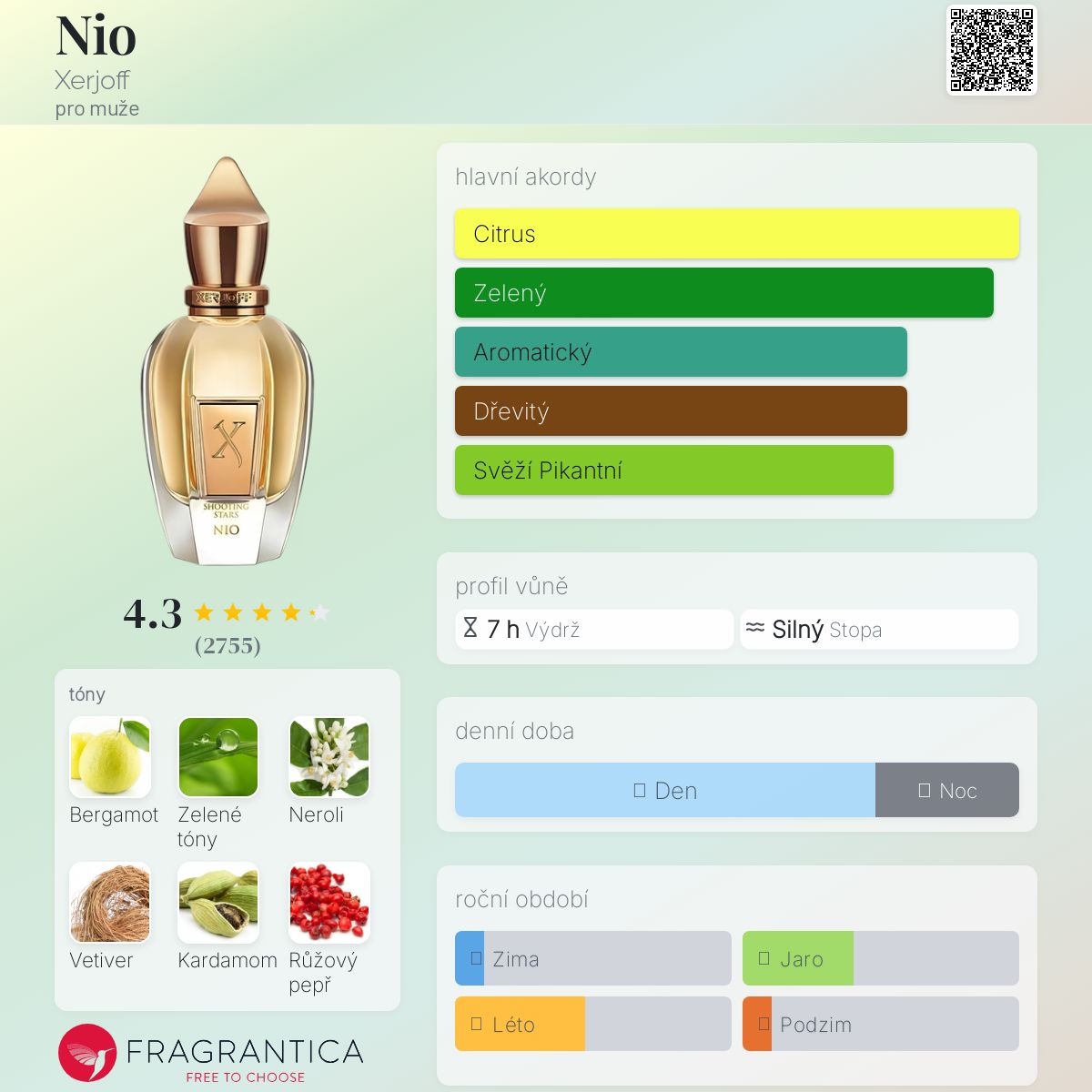 Nio je šťavnatá a zelená jako pomerančový háj. Je věrná módu Xerjoff, první hodinu výbušná jako 1861 Renaissance, pak se zklidní, ale stále velmi výrazná, každý tón oznamuje mimořádně vysokou kvalitu ingrediencí. Má také kontinuální směs, která se stala charakteristickým znakem řady Xerjoff. Dobrá zpráva pro ty, kteří se nemohou nabažit jiných niche citrusových kolínských, protože nestálost žánru a Nio vydrží a vydrží HODNĚ!