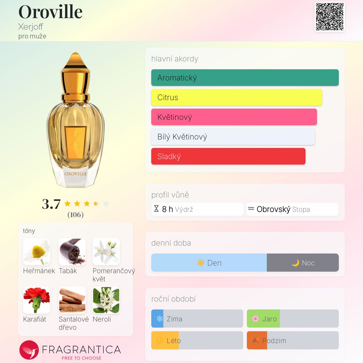 Oroville podle Xerjoff je Aromatic vůně pro muže. Oroville byl/a uveden/a v roce 2009. Vrchní tóny jsou Heřmánek, Pomeranč a Šalvěj muškátová; střední tóny jsouTabák, Květ afrického pomeranče, Karafiát, Neroli a Galbanum ; základní tóny jsou Santalové dřevo, Vanilka, Jantar (ambra) a Pižmo.