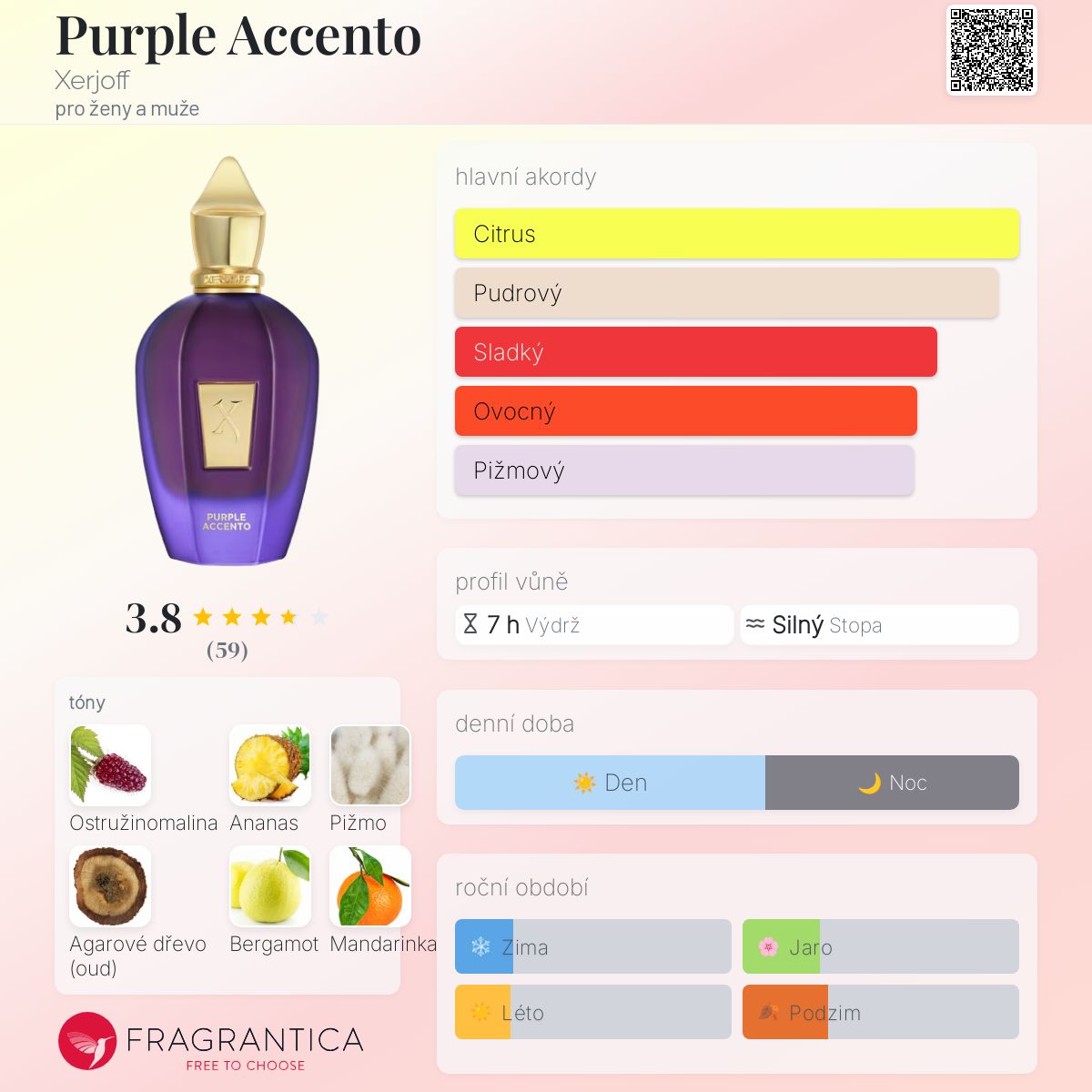 Purple Accento podle Xerjoff je Orientální Floral vůně pro ženy a muže. Toto je nová vůně. Purple Accento byl/a uveden/a v roce 2025. Vrchní tóny jsou Ananas, Bergamot, Mandarinka a Hyacint; střední tóny jsouOstružinomalina, Jasmín, Orris a Růžový pepř ; základní tóny jsou Pižmo, Agarové dřevo (oud), Vanilka, Santalové dřevo a Jantar (ambra).