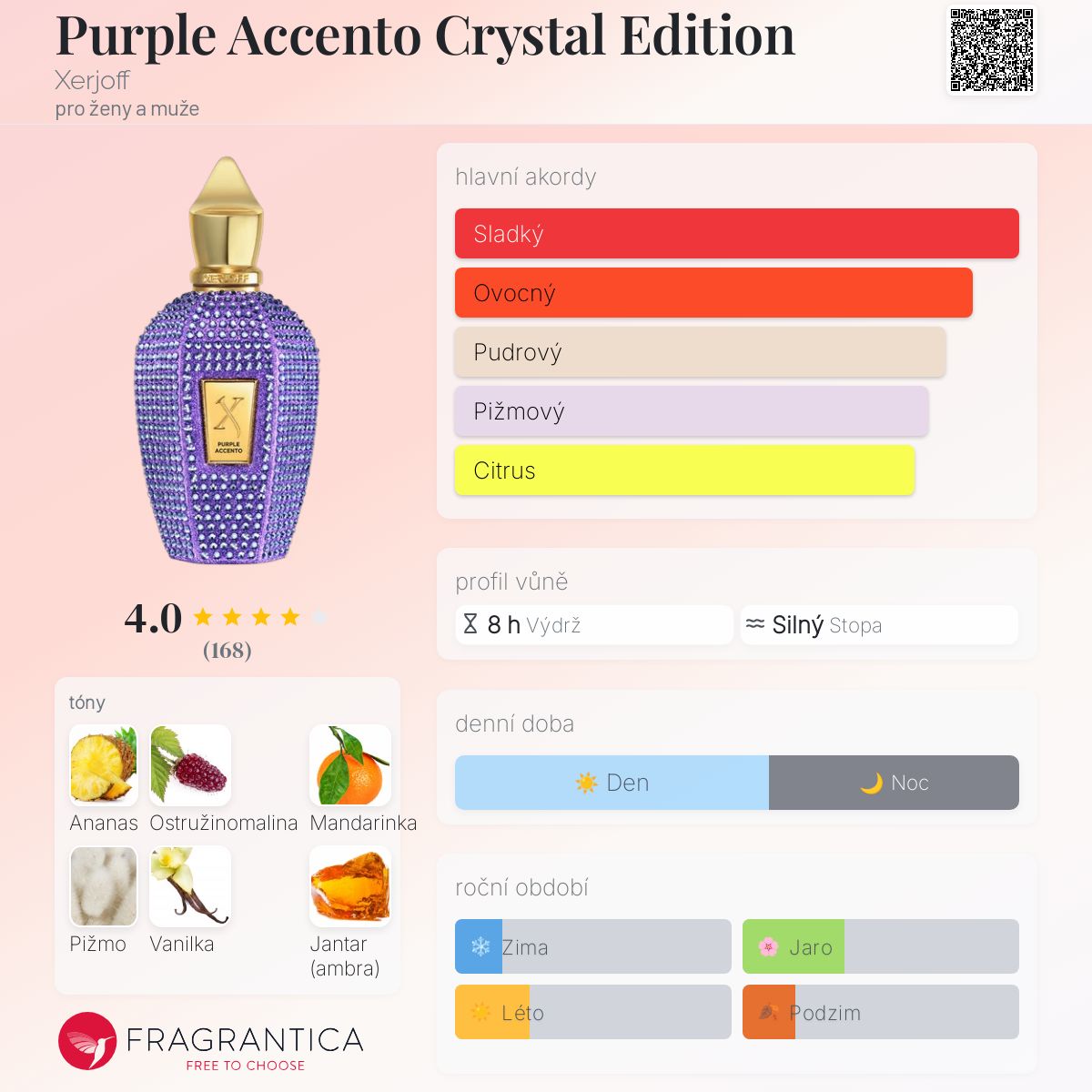 Purple Accento Crystal Edition podle Xerjoff je Orientální Floral vůně pro ženy a muže. Purple Accento Crystal Edition byl/a uveden/a v roce 2021. "Nosem" za touto vůní je Chris Maurice. Vrchní tóny jsou Ananas, Mandarinka a Hyacint; střední tóny jsouOstružinomalina, Růžový pepř, Jasmín a Kořen orris ; základní tóny jsou Pižmo, Vanilka, Jantar (ambra), Agarové dřevo (oud) a Santalové dřevo.