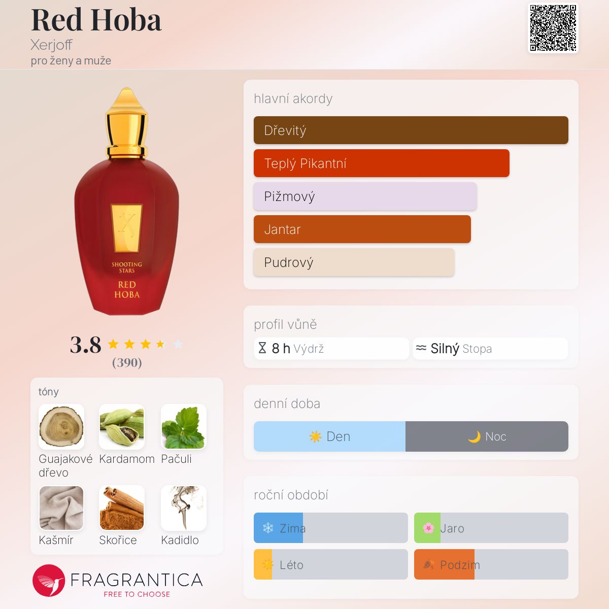 Red Hoba podle Xerjoff je Orientální Vanilla vůně pro ženy a muže. Red Hoba byl/a uveden/a v roce 2014. "Nosem" za touto vůní je Chris Maurice. Vrchní tóny jsou Kardamom, Skořice a Bergamot; střední tóny jsouPačuli, Kadidlo, Orris a Jasmín ; základní tóny jsou Guajakové dřevo, Kašmír, Pižmo, Papyrus, Labdanum a Kastoreum.