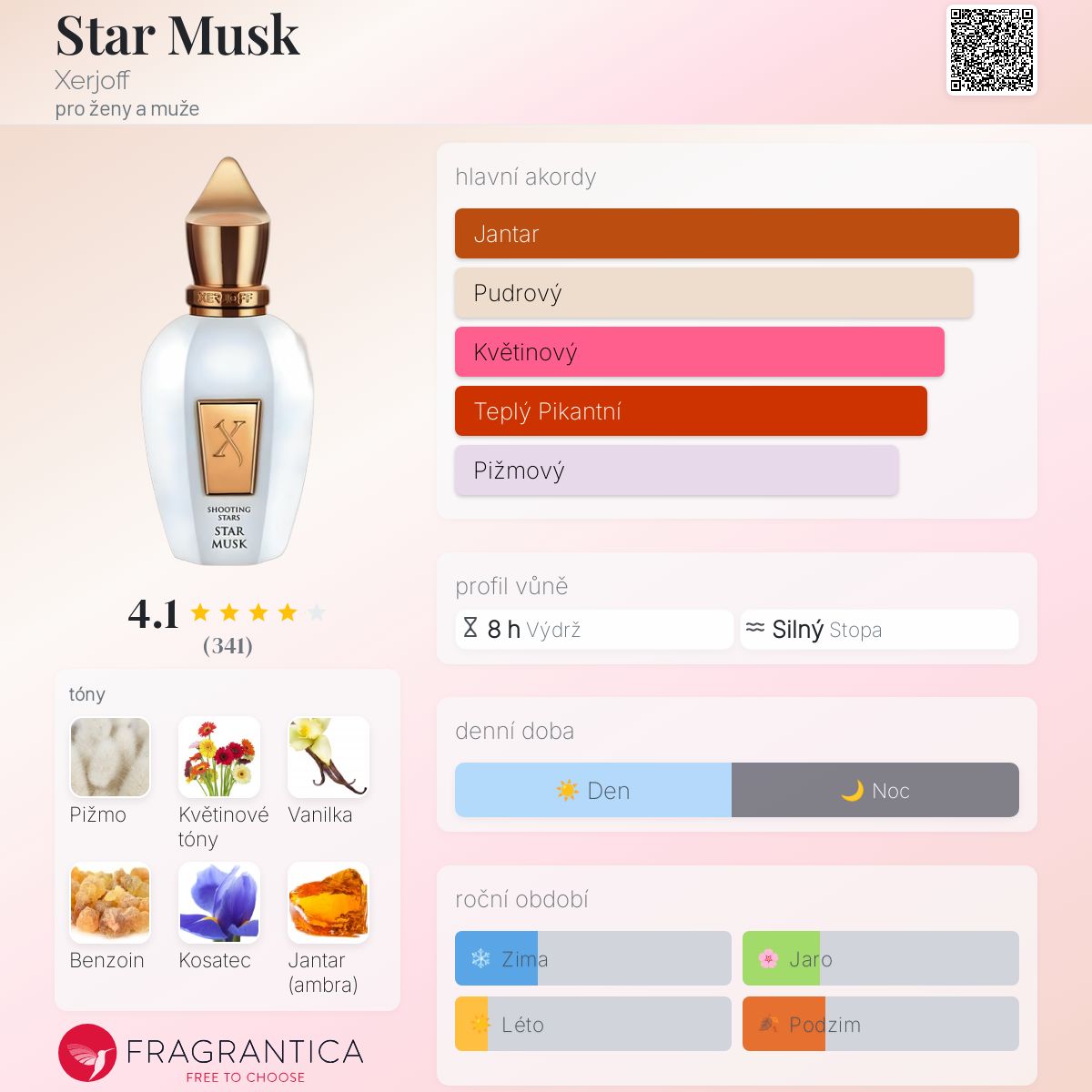 Star Musk podle Xerjoff je Floral Woody Musk vůně pro ženy a muže. Star Musk byl/a uveden/a v roce 2013. "Nosem" za touto vůní je Chris Maurice. Vrchní tóny jsou Květinové tóny, Jantar (ambra) a Mandarinka; střední tóny jsouKosatec, Santalové dřevo, Pačuli, Karafiát, Skořice a Vetiver ; základní tóny jsou Pižmo, Vanilka, Benzoin, Santalové dřevo a Opoponax.