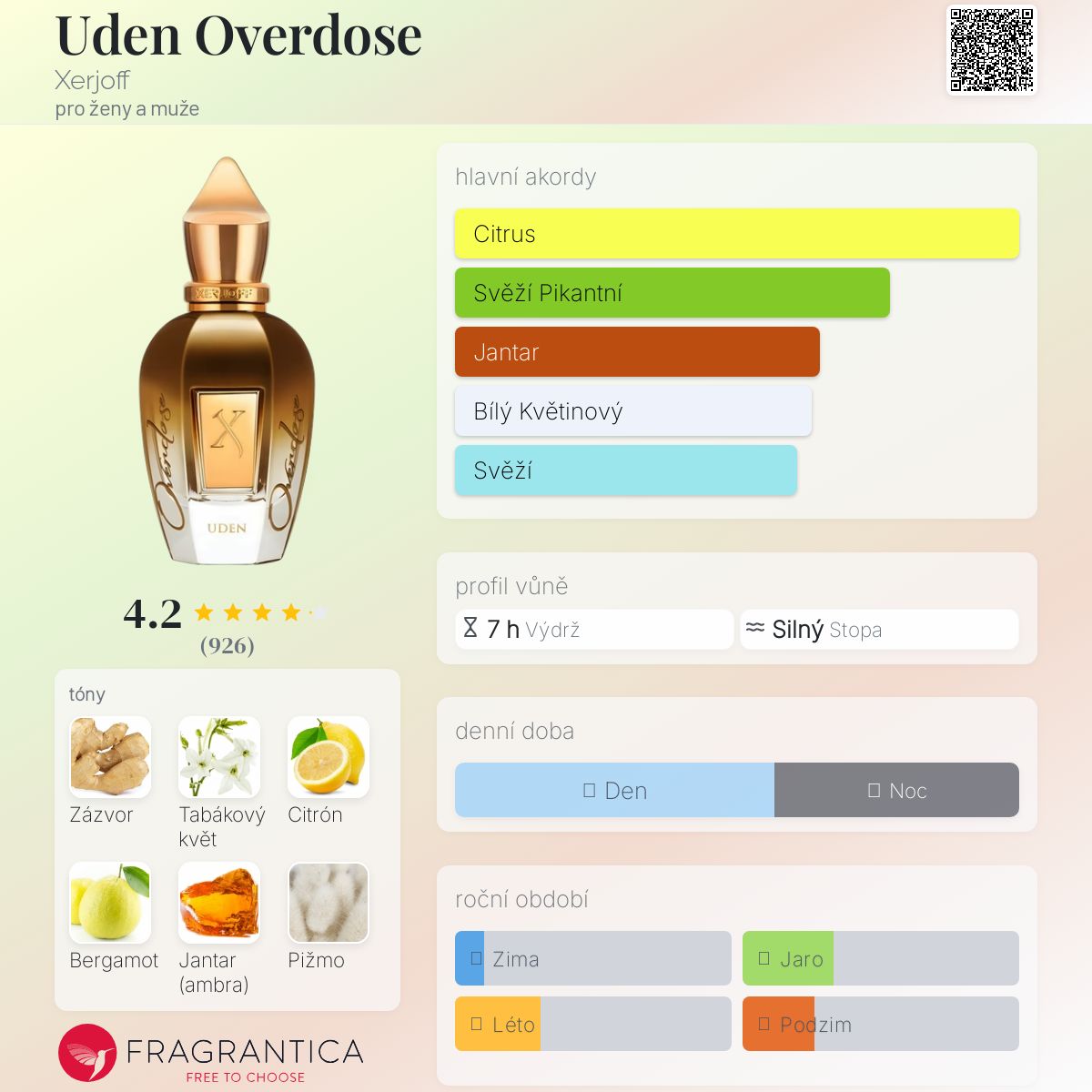 Uden Overdose podle Xerjoff je Woody Spicy vůně pro ženy a muže. Uden Overdose byl/a uveden/a v roce 2018. "Nosem" za touto vůní je Chris Maurice. Vrchní tóny jsou Citrón a Bergamot; střední tóny jsouZázvor a Tabákový květ ; základní tóny jsou Jantar (ambra) a Pižmo.