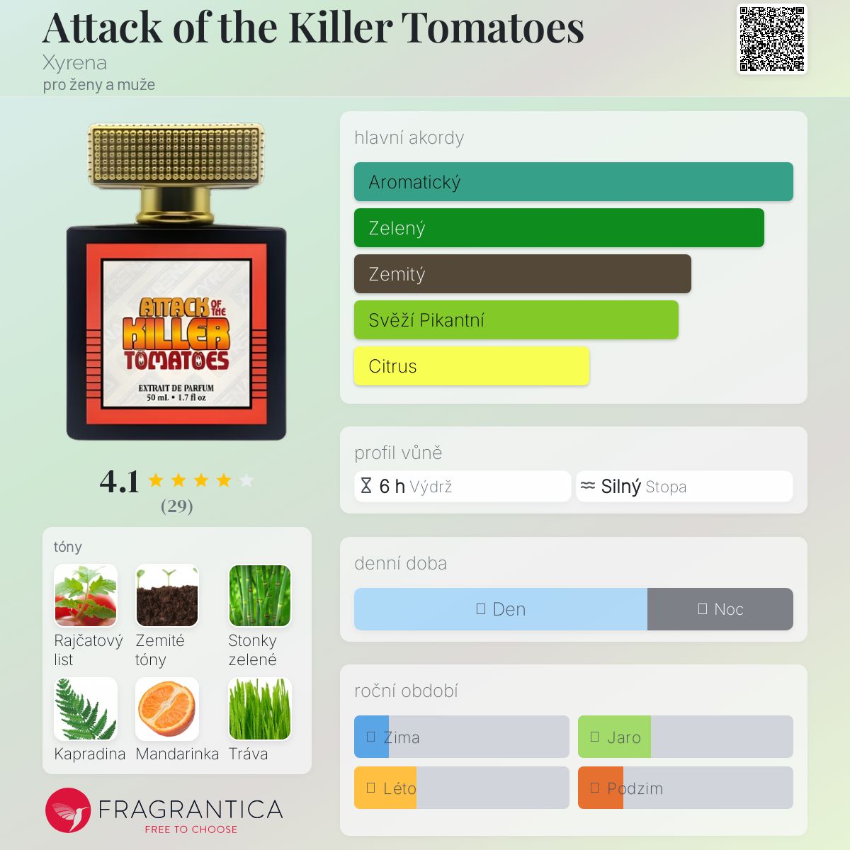 Attack of the Killer Tomatoes podle Xyrena je Aromatic Green vůně pro ženy a muže. Toto je nová vůně. Attack of the Killer Tomatoes byl/a uveden/a v roce 2024.