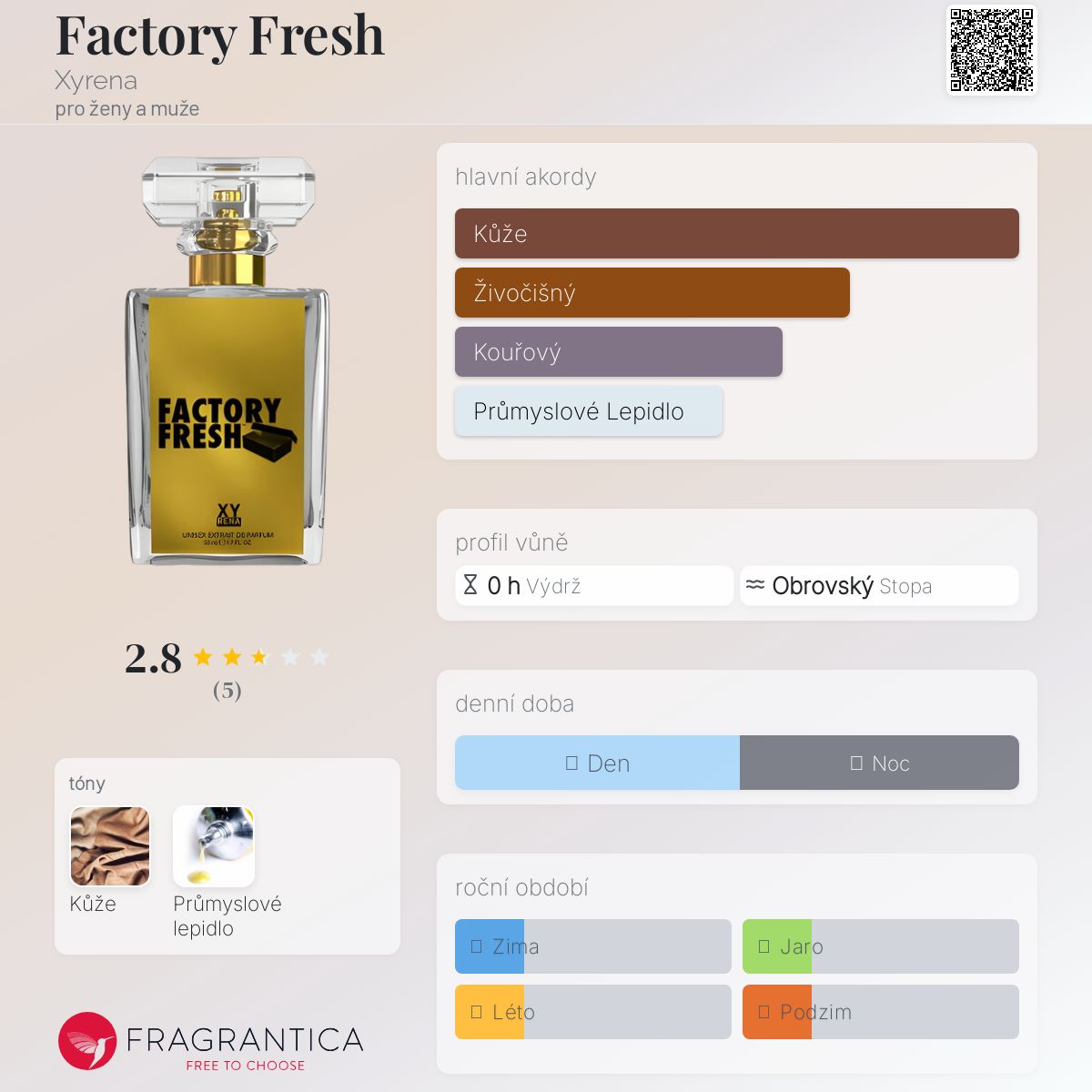 Factory Fresh podle Xyrena je Leather vůně pro ženy a muže. Factory Fresh byl/a uveden/a v roce 2015. "Nosem" za touto vůní je Killian Wells.