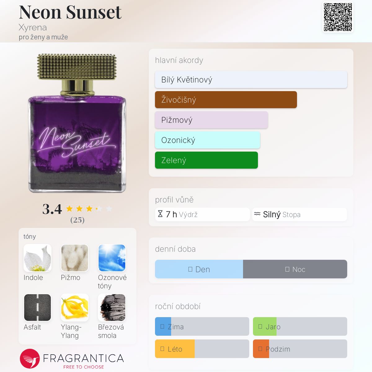 Neon Sunset podle Xyrena je Floral vůně pro ženy a muže. Neon Sunset byl/a uveden/a v roce 2020. "Nosem" za touto vůní je Killian Wells.