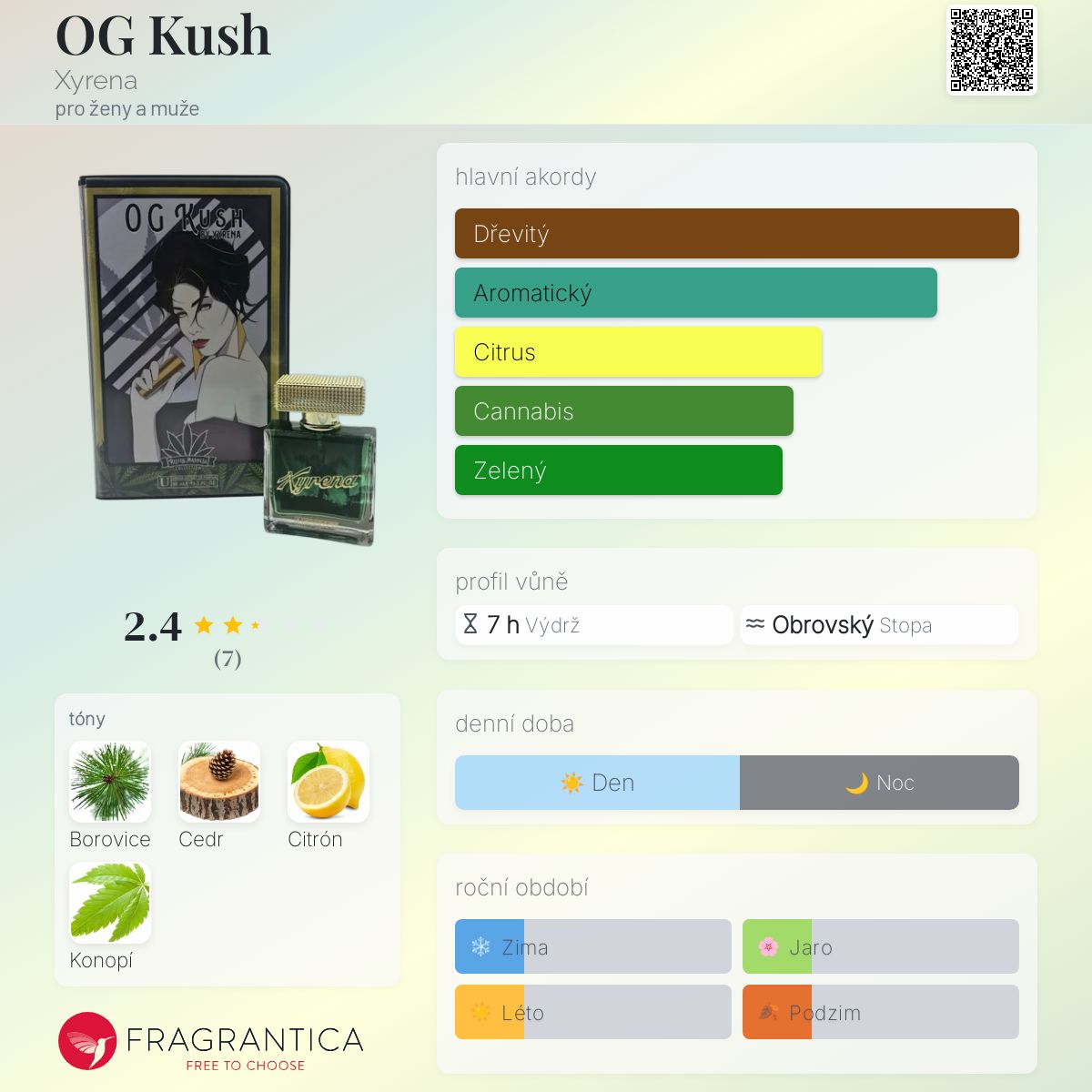 OG Kush podle Xyrena je Aromatic vůně pro ženy a muže. OG Kush byl/a uveden/a v roce 2017. "Nosem" za touto vůní je Killian Wells.