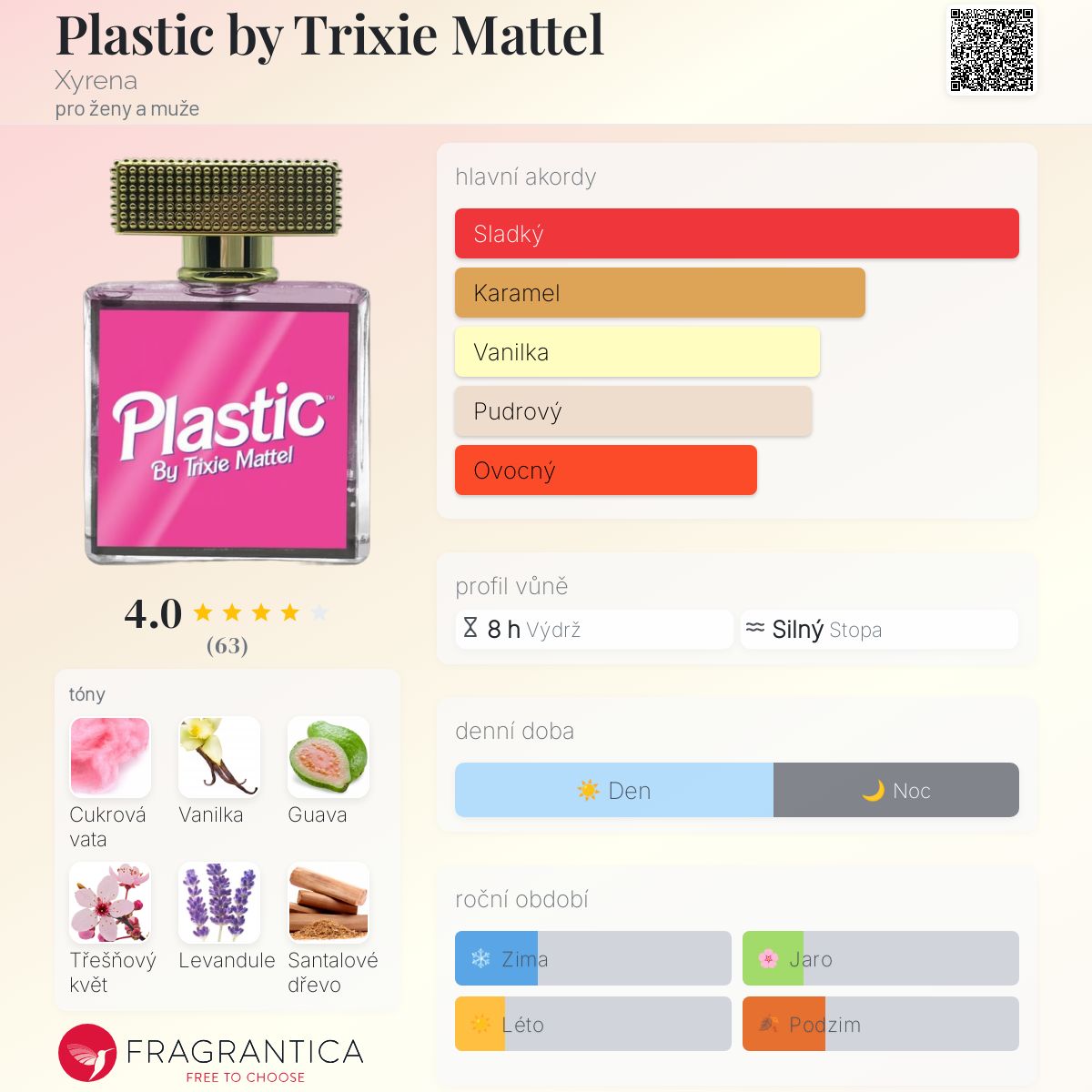Plastic by Trixie Mattel podle Xyrena je Floral Fruity Gourmand vůně pro ženy a muže. Plastic by Trixie Mattel byl/a uveden/a v roce 2017. "Nosem" za touto vůní je Killian Wells. Vrchní tóny jsou Guava, Levandule a Bergamot; střední tóny jsouTřešňový květ a Cedr ; základní tóny jsou Cukrová vata, Vanilka, Santalové dřevo a Jantar (ambra).