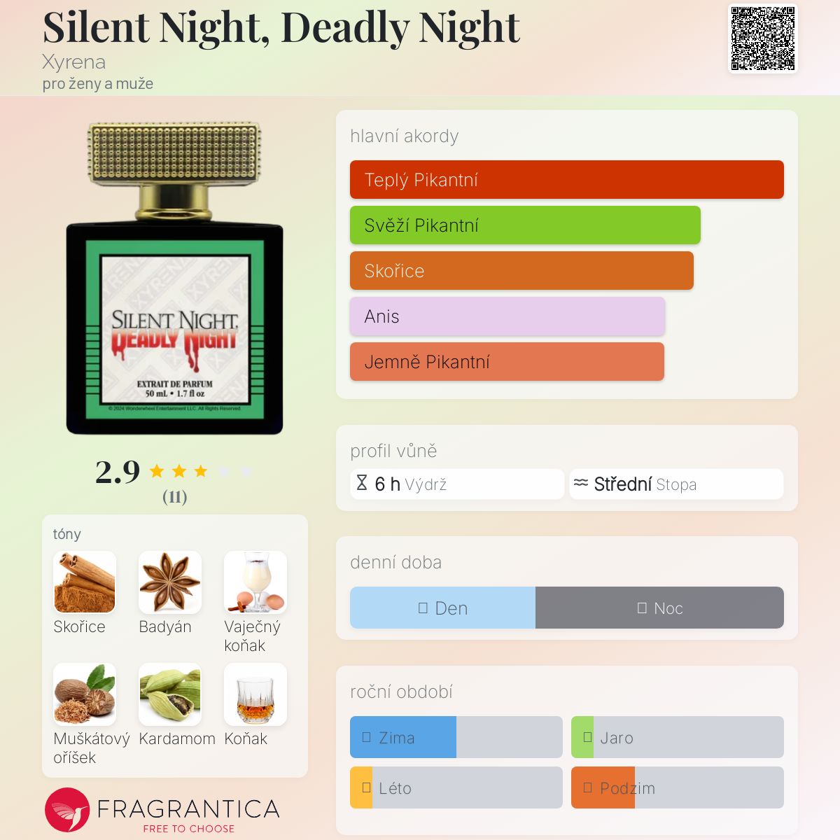 Silent Night, Deadly Night podle Xyrena je Orientální Spicy vůně pro ženy a muže. Toto je nová vůně. Silent Night, Deadly Night byl/a uveden/a v roce 2024. "Nosem" za touto vůní je Killian Wells. Vrchní tóny jsou Badyán, Pikantní máta a Pomeranč; střední tóny jsouSkořice, Brandy a Amarylka ; základní tóny jsou Vaječný koňak, Muškátový oříšek, Kardamom a Vanilka.