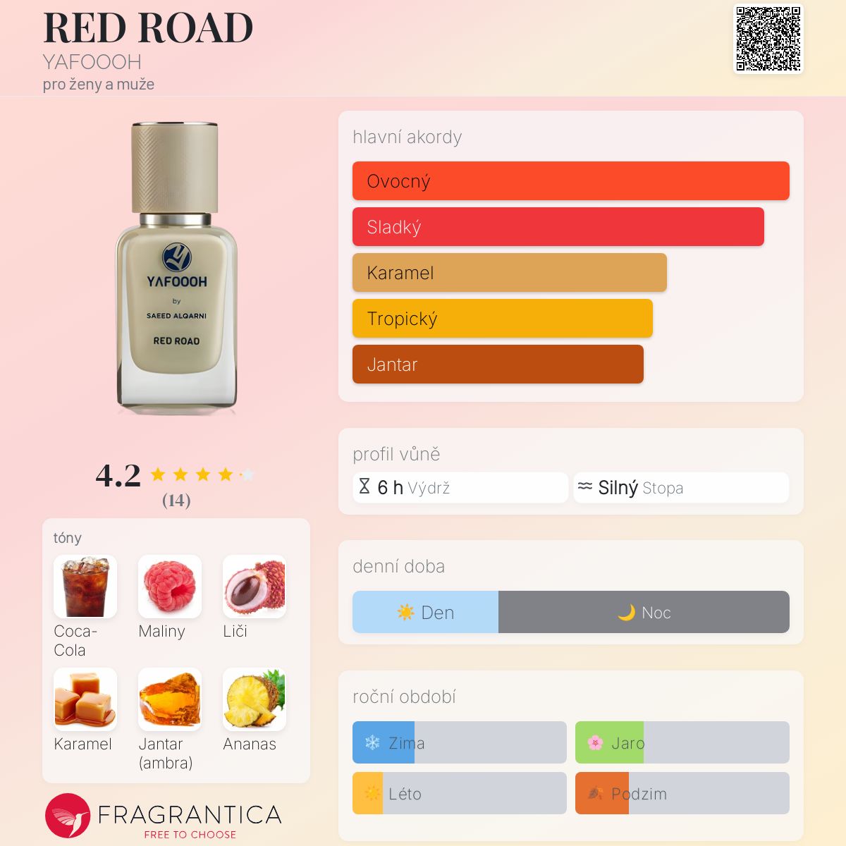 RED ROAD podle YAFOOOH je Chypre Fruity vůně pro ženy a muže. RED ROAD byl/a uveden/a v roce 2022. "Nosem" za touto vůní je Saeed Alqarni. Vrchní tóny jsou Coca-Cola, Ananas, Grapefruit, Citrón a Rum; střední tóny jsouMaliny, Liči, Kokos, Ylang-Ylang a Kosatec ; základní tóny jsou Karamel, Jantar (ambra), Santalové dřevo, Tabák a Pačuli.