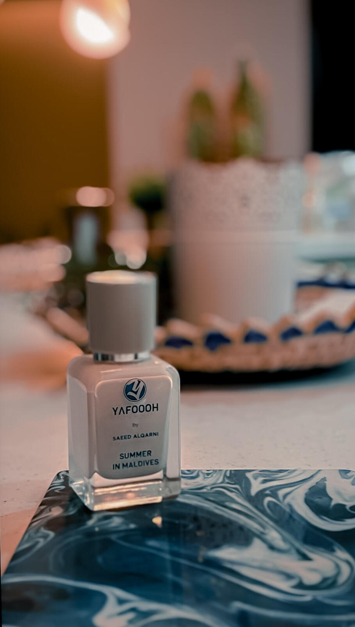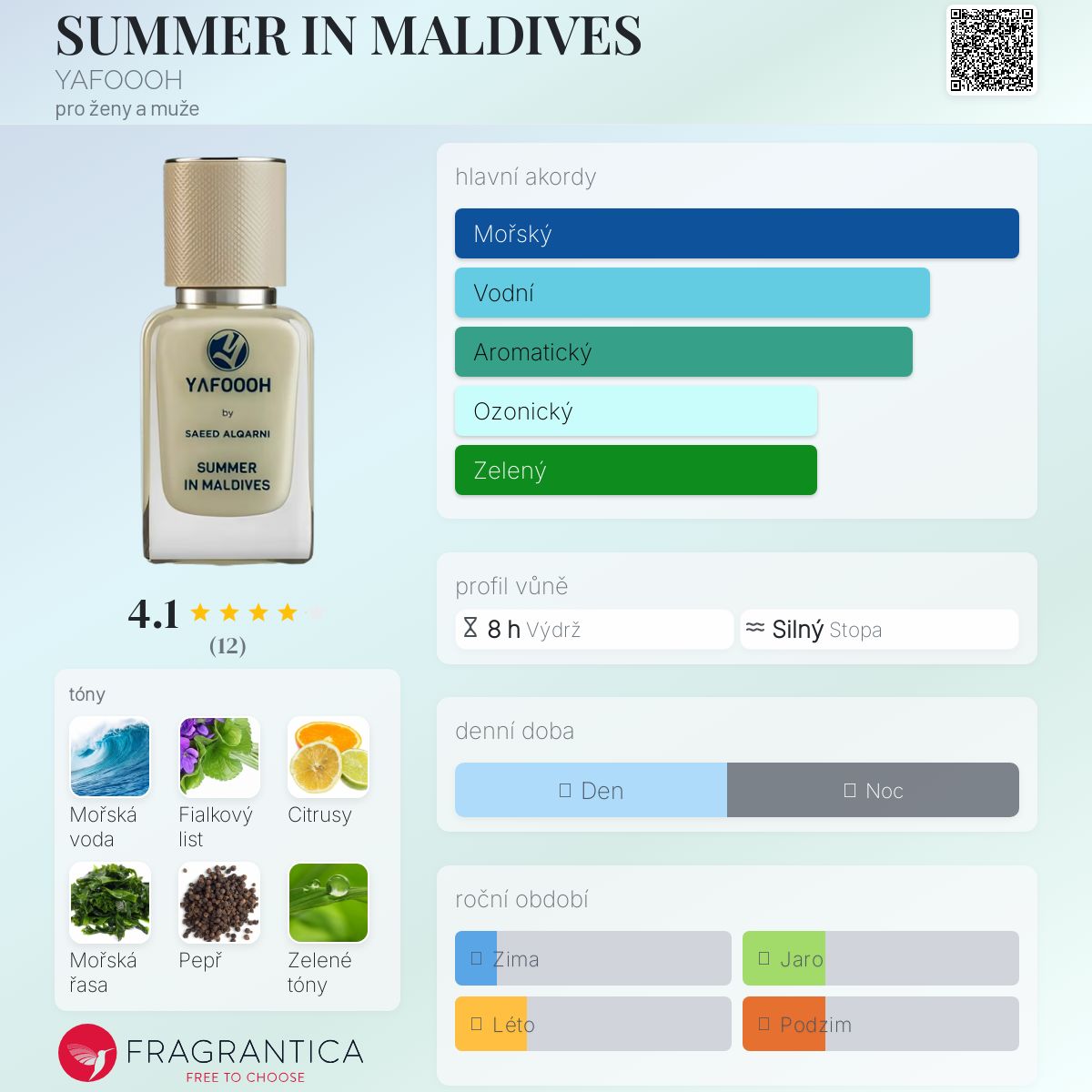 SUMMER IN MALDIVES podle YAFOOOH je Aromatic Aquatic vůně pro ženy a muže. Toto je nová vůně. SUMMER IN MALDIVES byl/a uveden/a v roce 2025. "Nosem" za touto vůní je Saeed Alqarni. Vrchní tóny jsou Citrusy, Černý pepř, Aromatické tóny, Švestka a Šalvěj muškátová; střední tóny jsouMořské tóny, Fialkový list, Zelené tóny, Koriandr, Cypřiš, Hřebíček a Lékořice ; základní tóny jsou Mořská řasa, Ambra, Santalové dřevo, Kašmír, Benzoin a Vetiver.