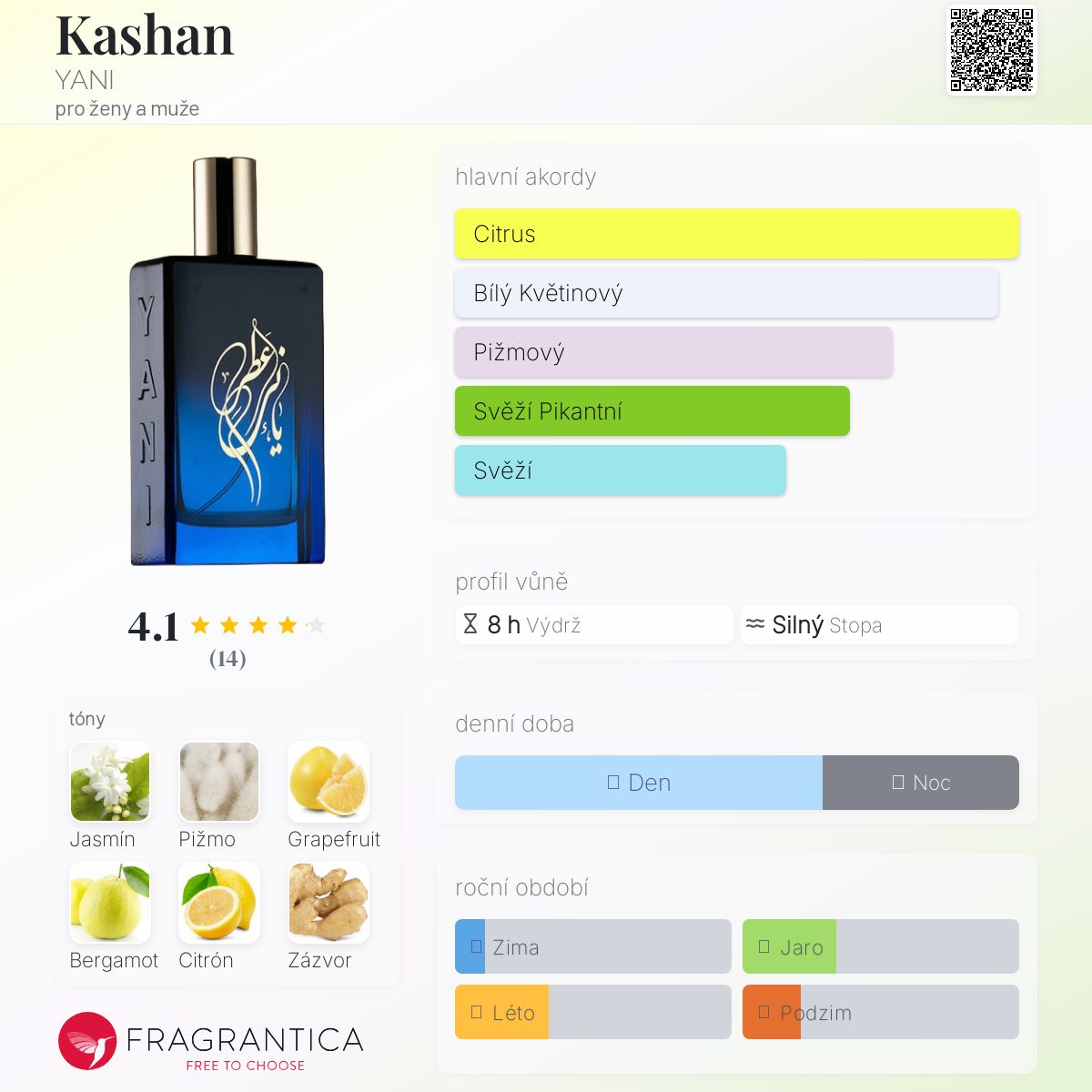 Kashan podle YANI je Aromatic vůně pro ženy a muže. Kashan byl/a uveden/a v roce 2022. "Nosem" za touto vůní je Hamid Merati-Kashani. Vrchní tóny jsou Grapefruit, Bergamot a Citrón; střední tóny jsouJasmín, Zázvor a Květinové tóny ; základní tóny jsou Pižmo, Jantar (ambra) a Dřevité tóny.
