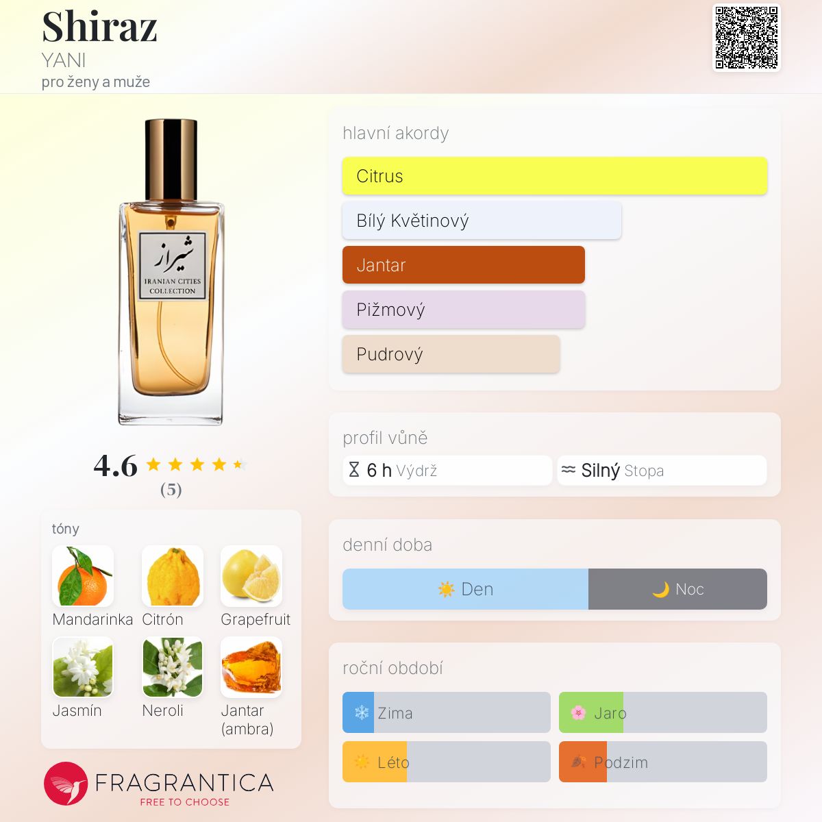 Shiraz podle YANI je Citrus vůně pro ženy a muže. Toto je nová vůně. Shiraz byl/a uveden/a v roce 2024. "Nosem" za touto vůní je Anne-Louise Gautier. Vrchní tóny jsou Mandarinka a Zedrát; střední tóny jsouGrapefruit a Jasmín ; základní tóny jsou Neroli, Jantar (ambra) a Pižmo.
