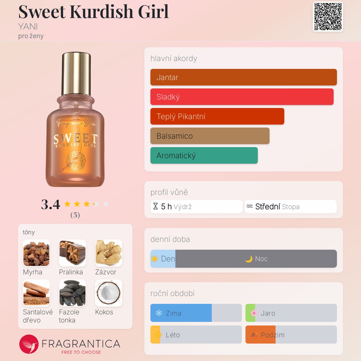 Sweet Kurdish Girl podle YANI je Orientální Vanilla vůně pro ženy. Toto je nová vůně. Sweet Kurdish Girl byl/a uveden/a v roce 2024. "Nosem" za touto vůní je Kantal Roussel. Vrchní tóny jsou Pralinka, Zázvor, Kokos a Mandle; střední tóny jsouMyrha, Ylang-Ylang, Otočník a Vanilkový květ ; základní tóny jsou Santalové dřevo, Fazole tonka, Vanilka a Benzoin.