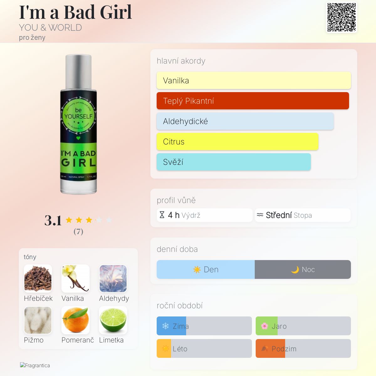 I'm a Bad Girl podle YOU & WORLD je Aromatic Spicy vůně pro ženy. I'm a Bad Girl byl/a uveden/a v roce 2024. Vrchní tóny jsou Aldehydy, Pomeranč a Limetka; střední tóny jsouHřebíček, Nové koření a Zázvor ; základní tóny jsou Vanilka a Pižmo.