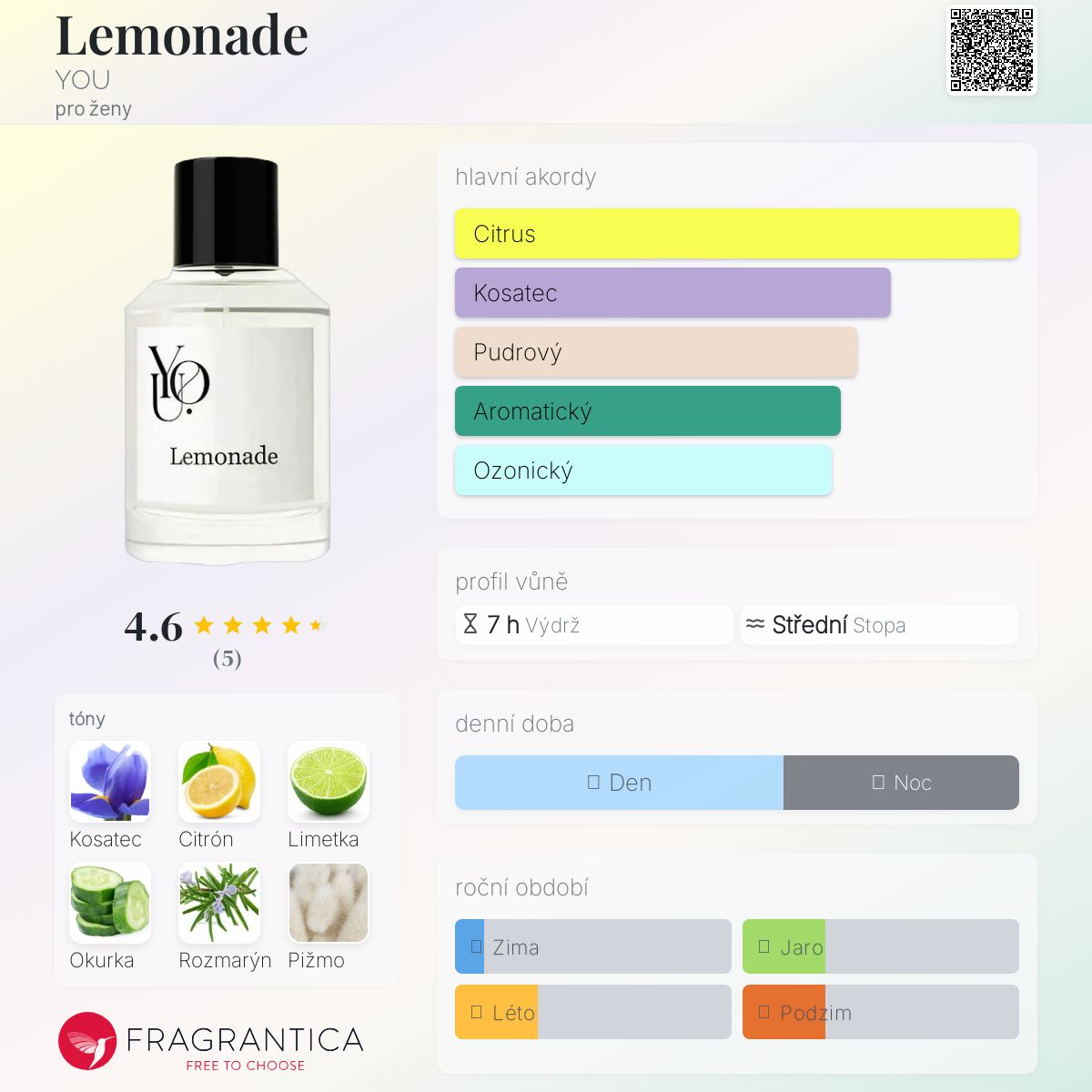 Lemonade podle YOU je Citrus Aromatic vůně pro ženy. Toto je nová vůně. Lemonade byl/a uveden/a v roce 2025. Vrchní tóny jsou Citrón a Limetka; střední tóny jsouOkurka, Rozmarýn, Pepř a Růže ; základní tóny jsou Kosatec, Pižmo a Cedr.