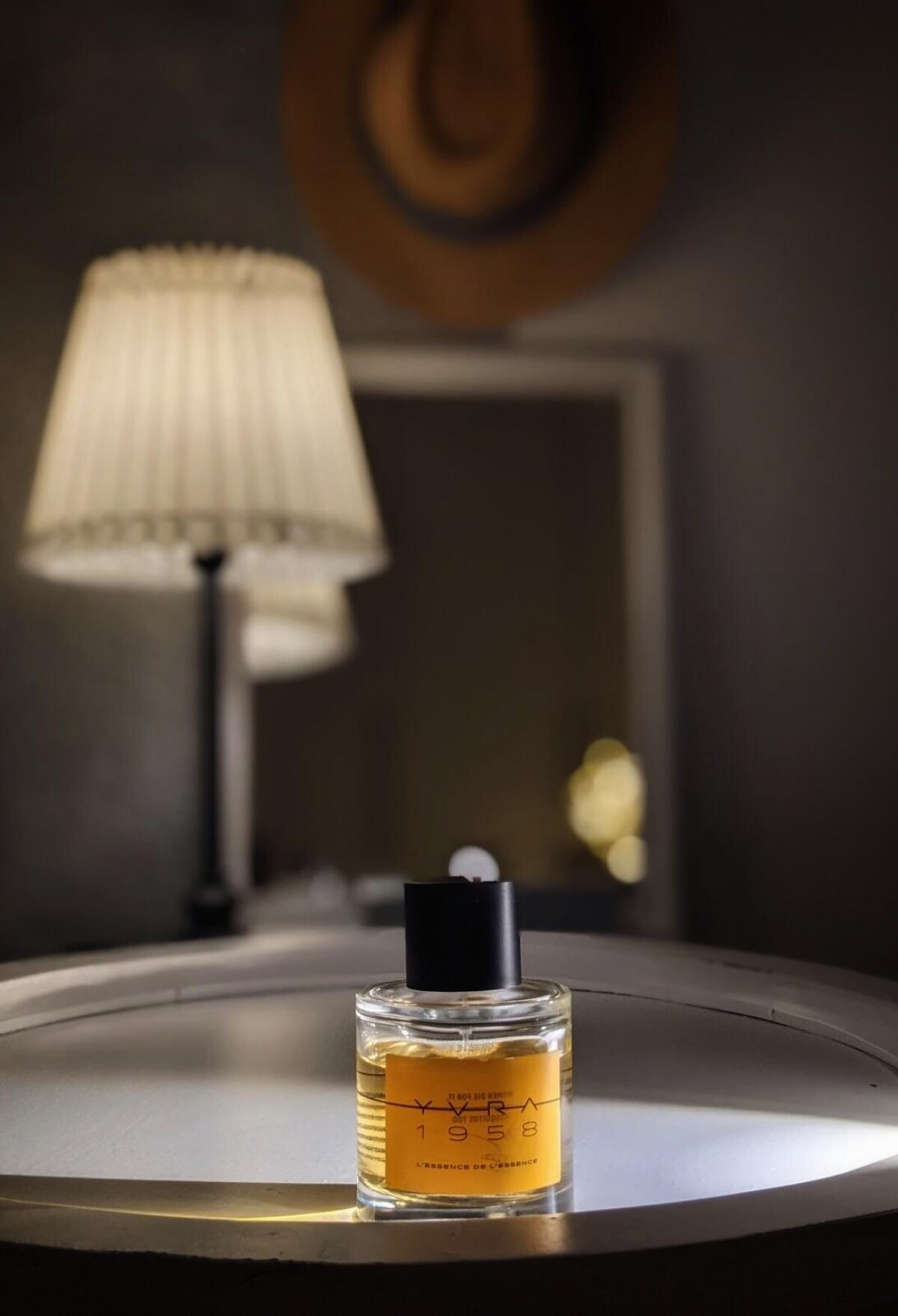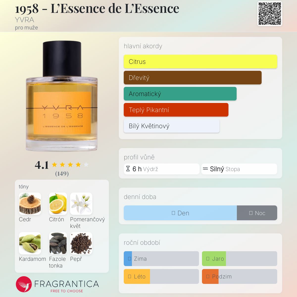 1958 - L’Essence de L’Essence podle YVRA je Woody Aromatic vůně pro muže. 1958 - L’Essence de L’Essence byl/a uveden/a v roce 2015. 1958 - L’Essence de L’Essence byl/a vytvořen/a Van Regteren Altena a Maarten Schoute. Vrchní tóny jsou Citrón, Pomerančový květ a Bergamot; střední tóny jsouCedr, Kardamom a Pepřový olej ; základní tóny jsou Fazole tonka, Santalové dřevo a Jantar (ambra).