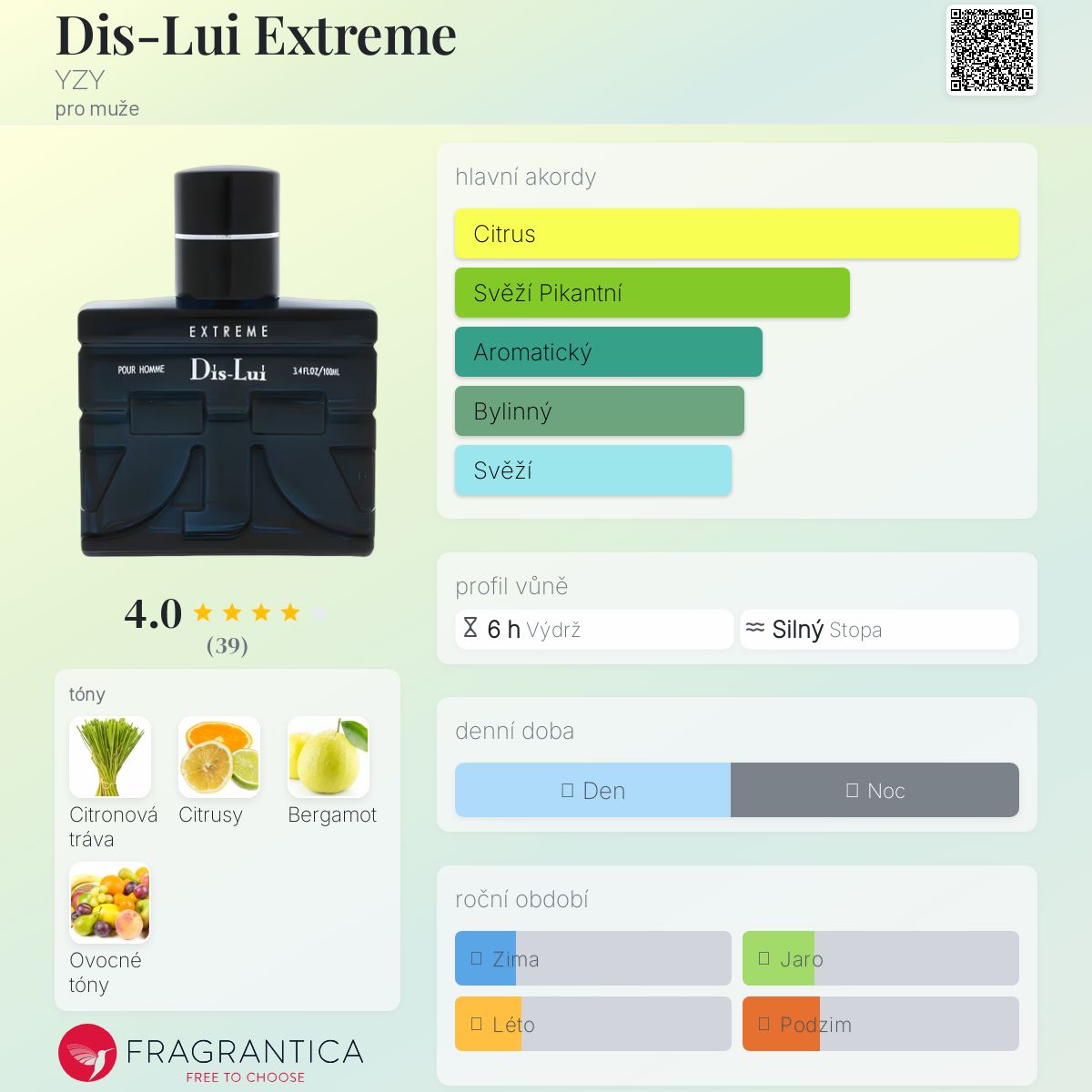Dis-Lui Extreme podle YZY je Citrus vůně pro muže. Dis-Lui Extreme byl/a uveden/a v roce 2017. Vrchní tóny jsou Citrusy a Bergamot; střední tóny jsouCitronová tráva a Ovoce ;