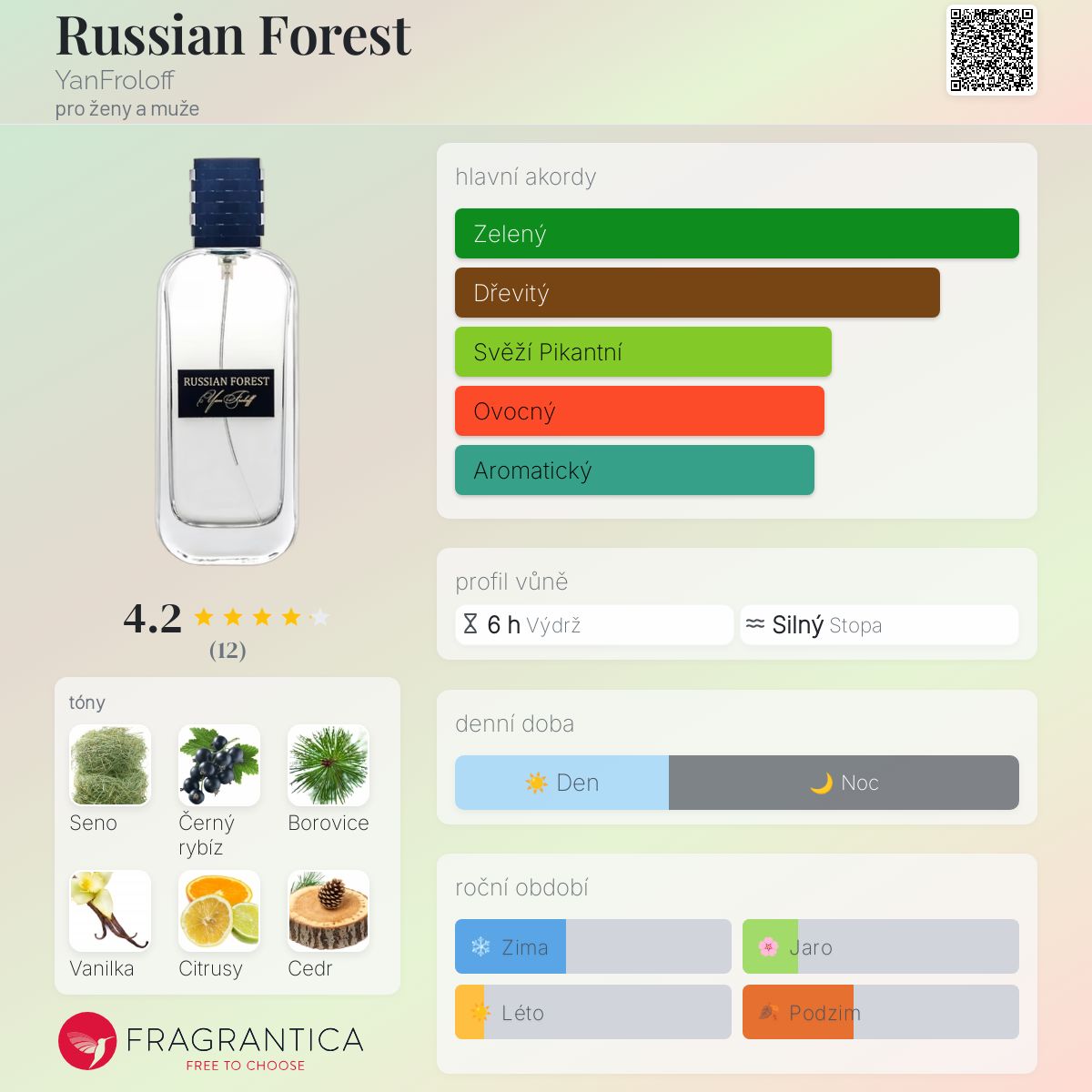 Russian Forest podle YanFroloff je Chypre Fruity vůně pro ženy a muže. Russian Forest byl/a uveden/a v roce 2017. "Nosem" za touto vůní je Yan Froloff. Vrchní tóny jsou Citrusy a Zelené tóny; střední tóny jsouČerný rybíz, Jehličí borovice, Cedr a Bílé květy ; základní tóny jsou Seno, Vanilka a Bílé pižmo.