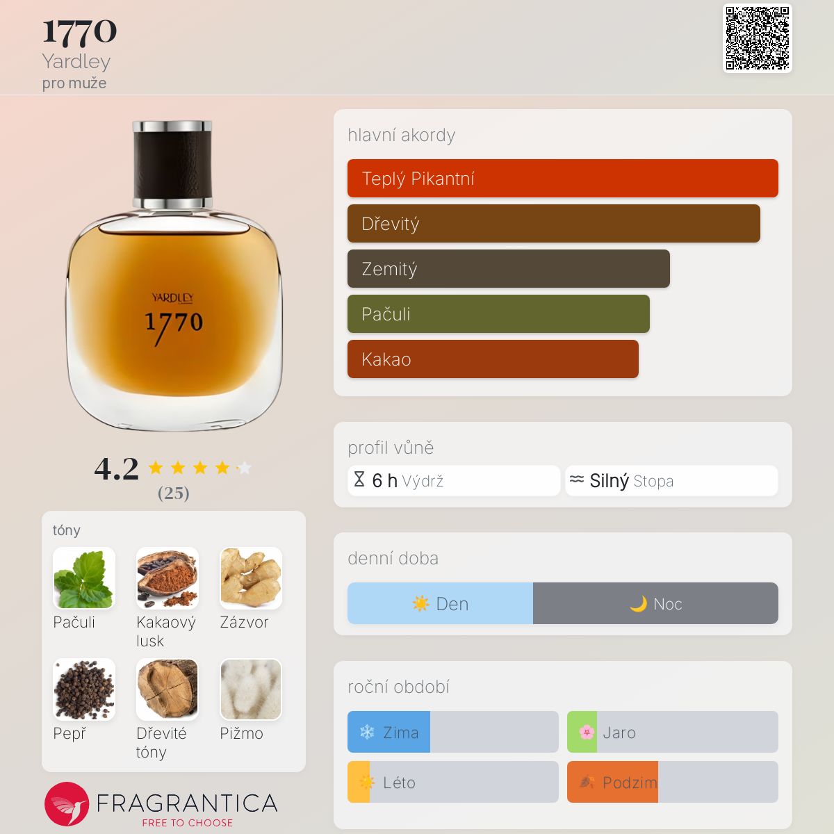 1770 podle Yardley je Woody Spicy vůně pro muže. 1770 byl/a uveden/a v roce 2016. Vrchní tóny jsou Zázvor, Černý pepř a Citrusy; střední tóny jsouKakao, Dřevité tóny a Květiny ; základní tóny jsou Pačuli, Pižmo, Vetiver a Mech.