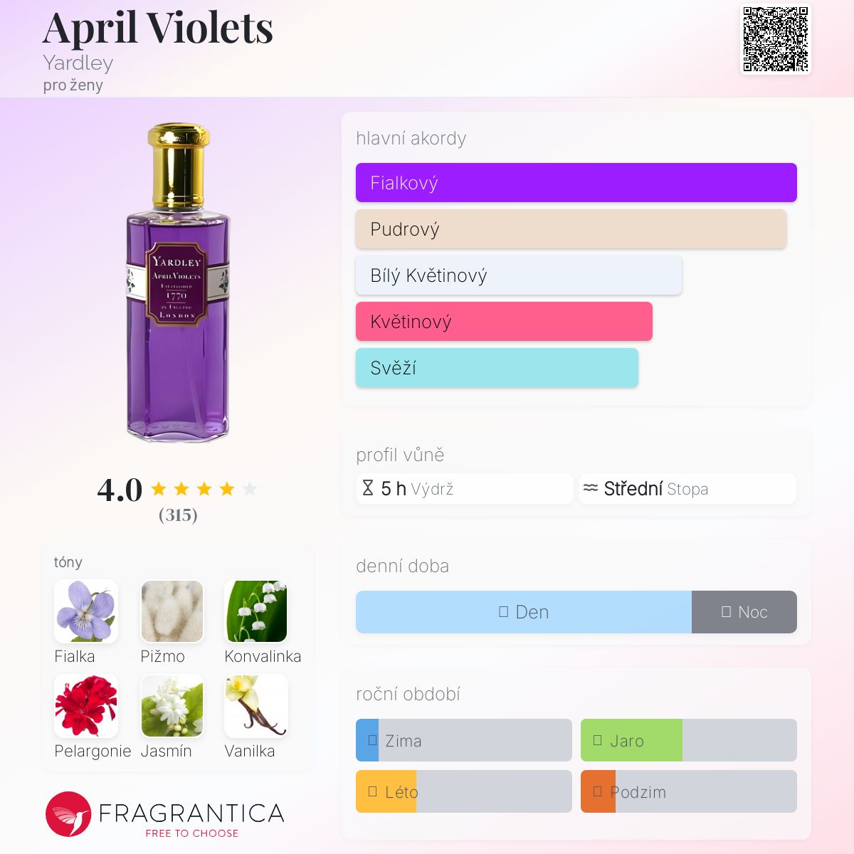 April Violets podle Yardley je Floral vůně pro ženy. April Violets byl/a uveden/a v roce 1913. Vrchní tón je Fialka ; střední tóny jsouKonvalinka, Pelargonie a Jasmín ; základní tóny jsou Pižmo a Vanilka.