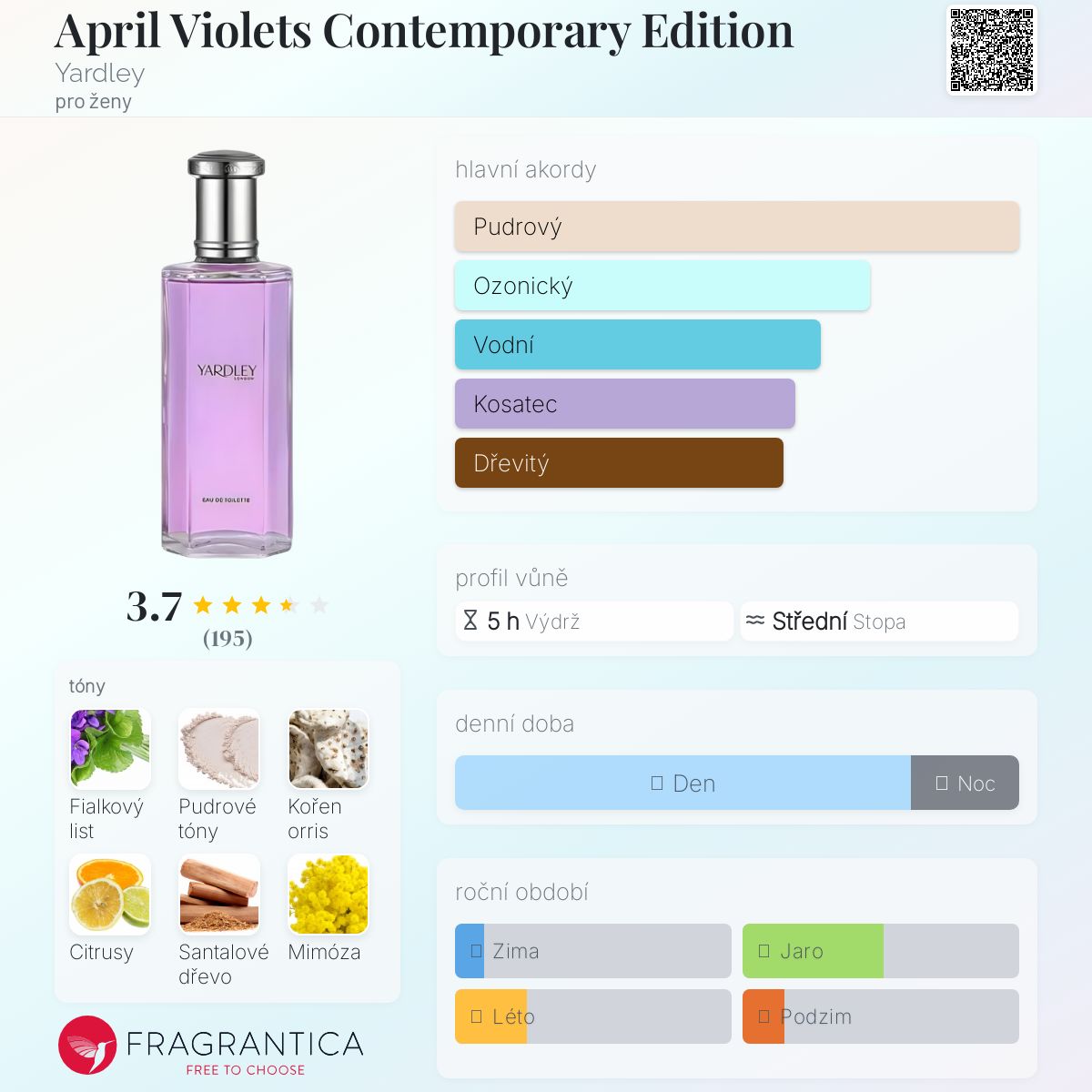 April Violets Contemporary Edition podle Yardley je Floral vůně pro ženy. April Violets Contemporary Edition byl/a uveden/a v roce 2015. Vrchní tóny jsou Fialkový list a Citrusy; střední tóny jsouOrris, Mimóza, Růže a Bílá broskev ; základní tóny jsou Pudrové tóny, Santalové dřevo a Vanilka.