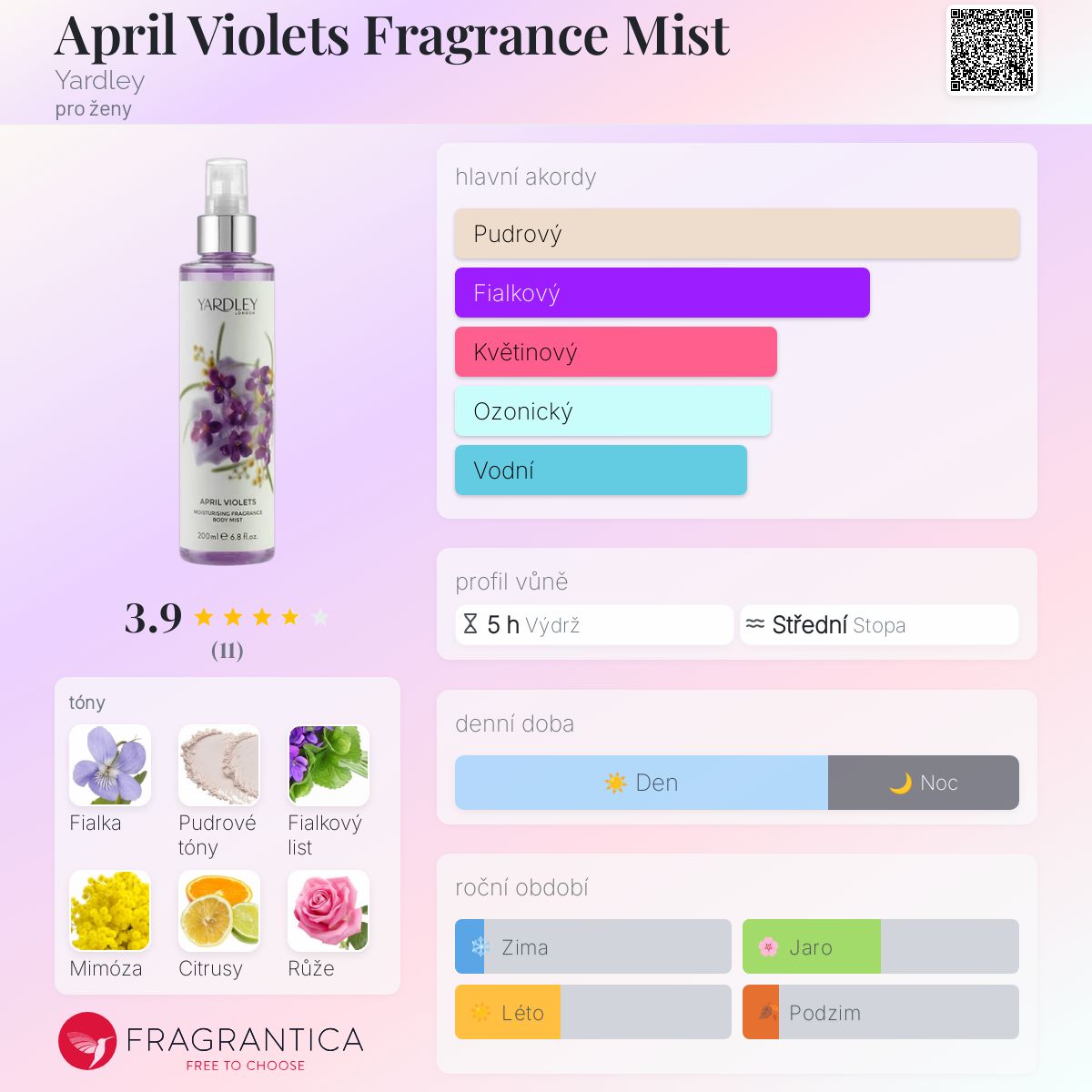 April Violets Fragrance Mist podle Yardley je Floral vůně pro ženy. April Violets Fragrance Mist byla spuštěna během 2010. Vrchní tóny jsou Fialkové listy a Citrusy; střední tóny jsouFialka, Mimóza, Růže a Bílá broskev ; základní tóny jsou Pudrové tóny, Santalové dřevo a Vanilka.