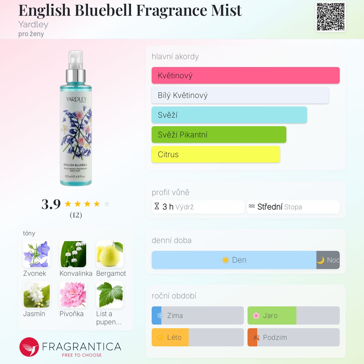 English Bluebell Fragrance Mist podle Yardley je Floral vůně pro ženy. English Bluebell Fragrance Mist byla spuštěna během 2010. Vrchní tóny jsou Bergamot a Černý rybíz; střední tóny jsouZvonek, Konvalinka, Jasmín, Pivoňka a Broskev ; základní tóny jsou Dřevité tóny, Pižmo a Vanilka.