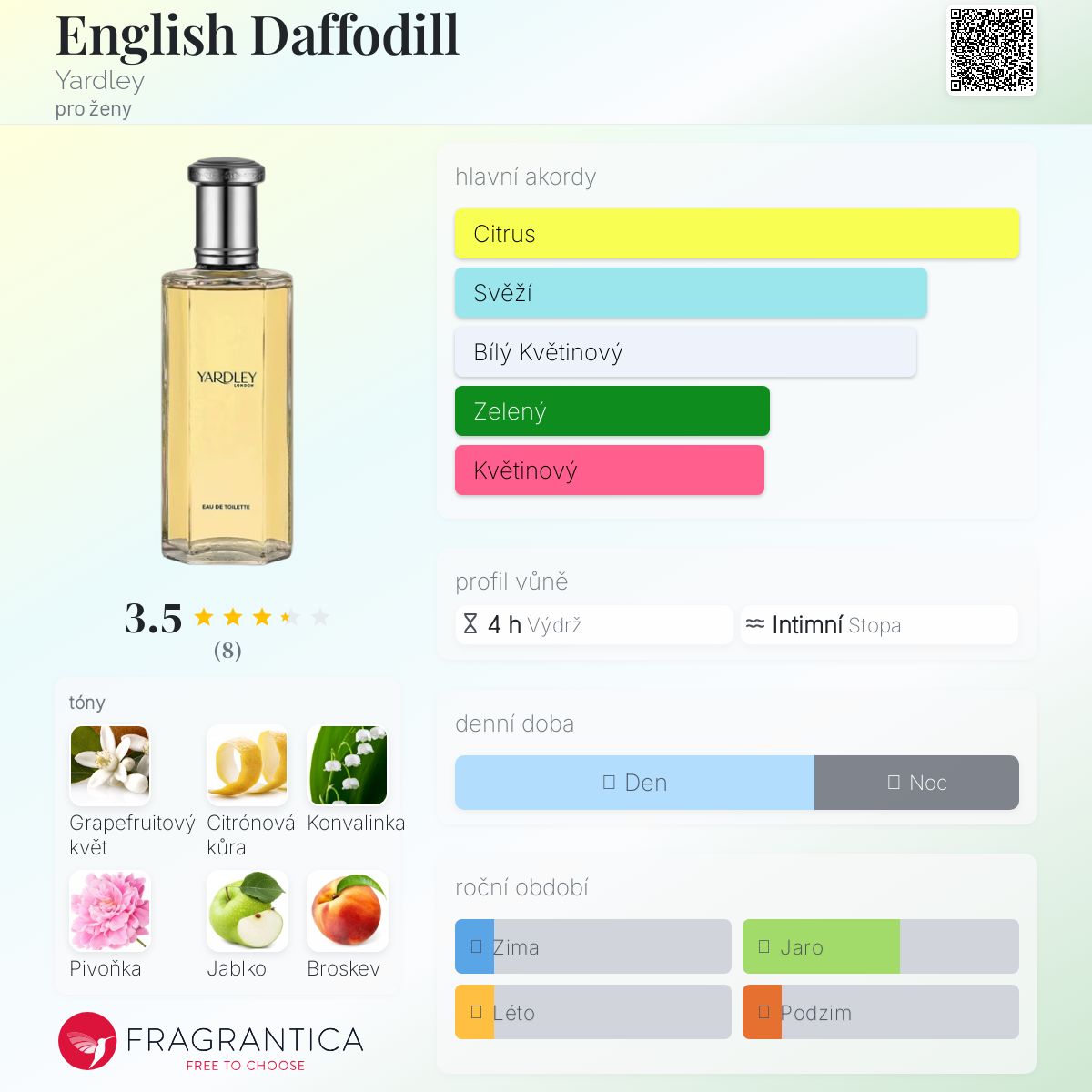 English Daffodill podle Yardley je vůně pro ženy. Toto je nová vůně. English Daffodill byl/a uveden/a v roce 2024. "Nosem" za touto vůní je Leslie Gauthier. Vrchní tóny jsou Grapefruitový květ, Citrónová kůra, Zelené jablko a Broskev; střední tóny jsouKonvalinka, Pivoňka, Narcis, Jasmín Sambac a Růže ; základní tóny jsou Cedr, Otočník, Pižmo a Jantar (ambra).